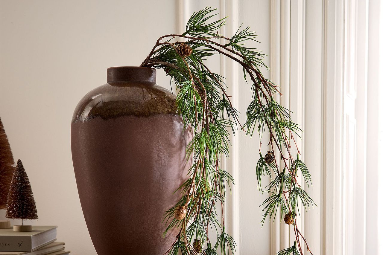 You can’t go wrong with incorporating some natural elements into your space, like real (or in this case, faux) pine branches. I love the droopy, more sparse look of this branch, along with the small pinecones adorning it—it just feels whimsical, like if Charlie Brown’s Christmas tree were a cool, stylish way to fill a beautiful vase.