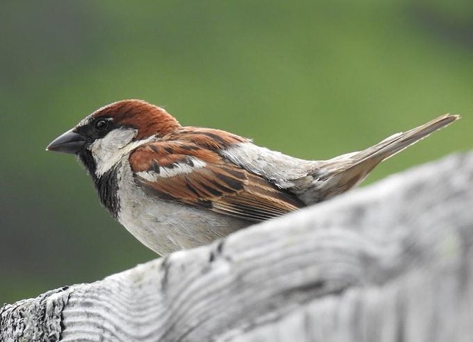 Unlike native sparrows, the house sparrow is an Old World species that was introduced to North America. It is commonly found near buildings and is chunkier than native sparrows. Breeding males have a black bib, white cheeks, a gray crown, and a reddish neck.