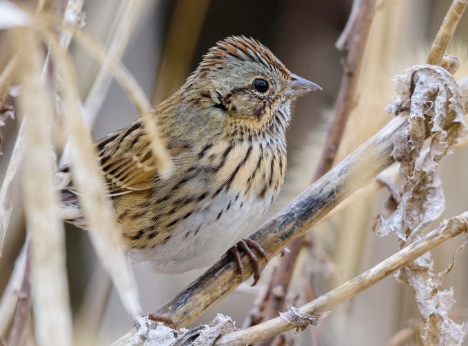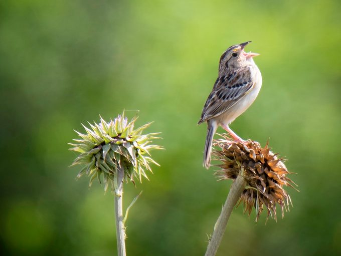 This small, shy sparrow is often heard more than seen. Its sibilant buzz resembles that of an insect, and it lives in fields and pastures. Unfortunately, its numbers are declining sharply.