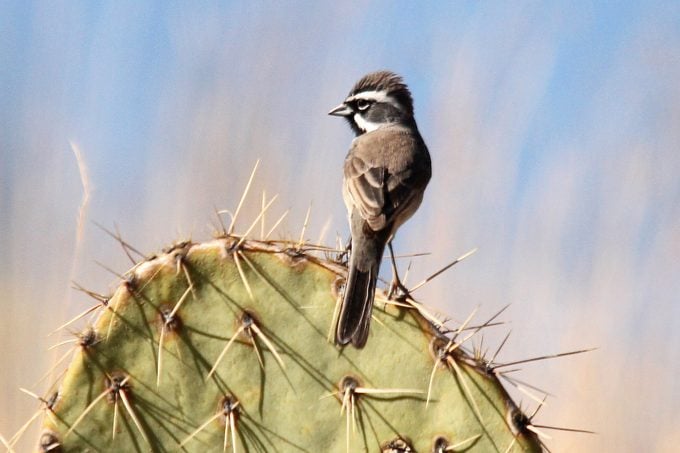A true desert bird, the black throated sparrow is found throughout the Southwest. It has a black throat and mask, with white eyebrow and whisker stripes. It can survive for long periods without water.