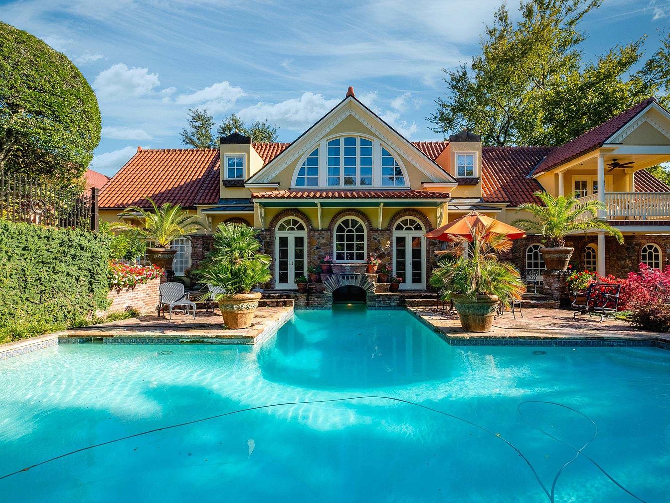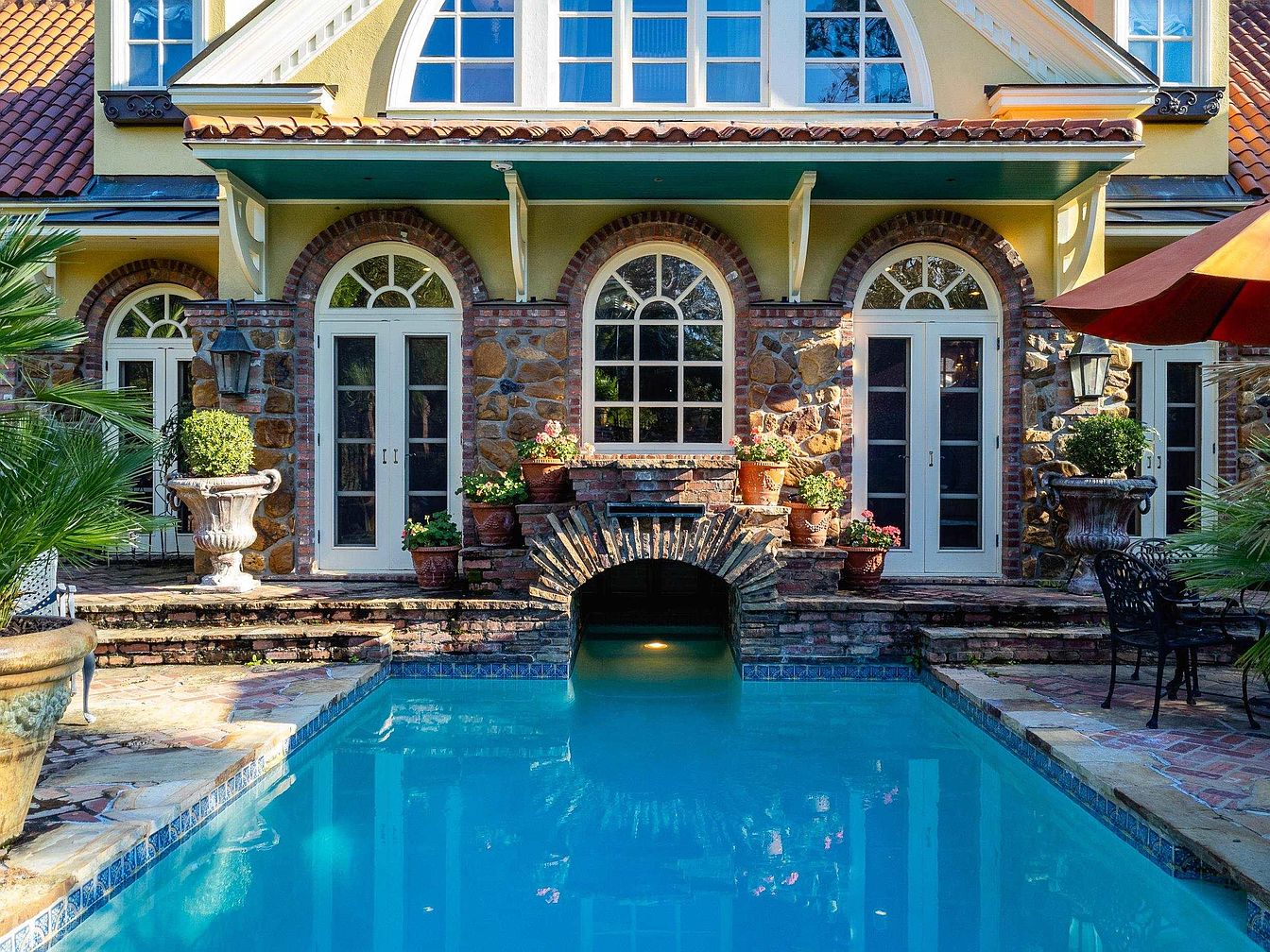 A serene rectangular pool extends from the house, surrounded by weathered natural stone and brick paving. Three sets of tall, white French doors with dramatic arched windows above them line the rear facade, framed by a mix of rustic brick and fieldstone. Potted plants in terracotta containers rest atop the stone ledge and steps, adding greenery and color. Two large classical urn planters flank the space, filled with trimmed shrubs. A small arched grotto feature sits at the pool’s edge, with a light illuminating the water beneath. The home boasts a tiled red roof, yellow stucco walls, and detailed trim for historic charm.