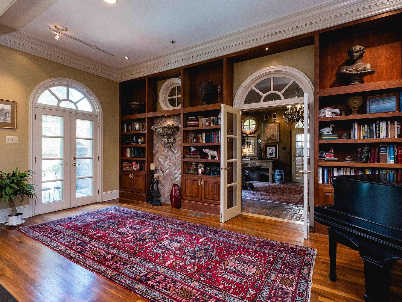 A spacious library features built-in wooden bookshelves lining the walls, filled with books and decorative sculptures. Rich golden-beige walls and intricate crown molding add a classic elegance. A bold red Persian rug anchors the warm wood floor, providing depth and texture. French doors with arched windows offer natural light and garden access on the left, while double glass doors lead to an adjoining, art-filled room. The room is further accented by a glossy black piano in the lower right and a leafy houseplant on the left, combining traditional style with cultured charm and inviting atmosphere.