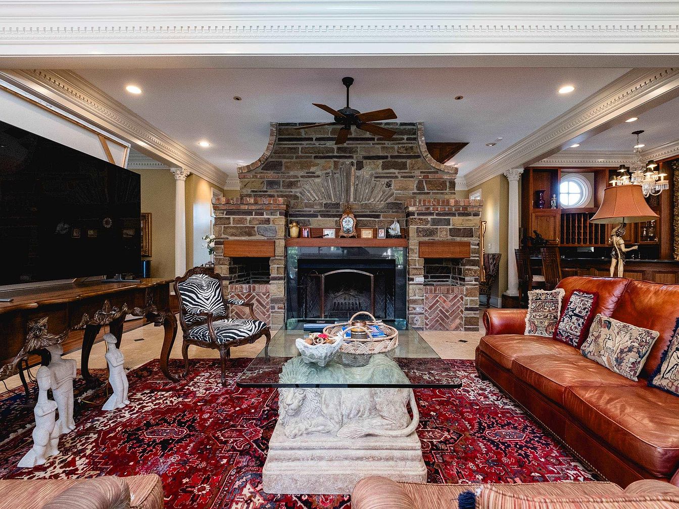 A spacious living area with a focal point of a grand stone fireplace flanked by brickwork and wooden mantels. The ceiling is bordered with elaborate white crown molding and recessed lighting, adding an air of refinement. In front of the fireplace sits a large glass coffee table with a sculpted lion base, set atop a richly patterned red Persian rug. The room features an elegant brown leather sofa adorned with intricate tapestry pillows, and a classic armchair upholstered in zebra print. Sculptural and wood furniture pieces, warm lighting, and a visible chandelier further enhance the sophisticated, historic ambiance.