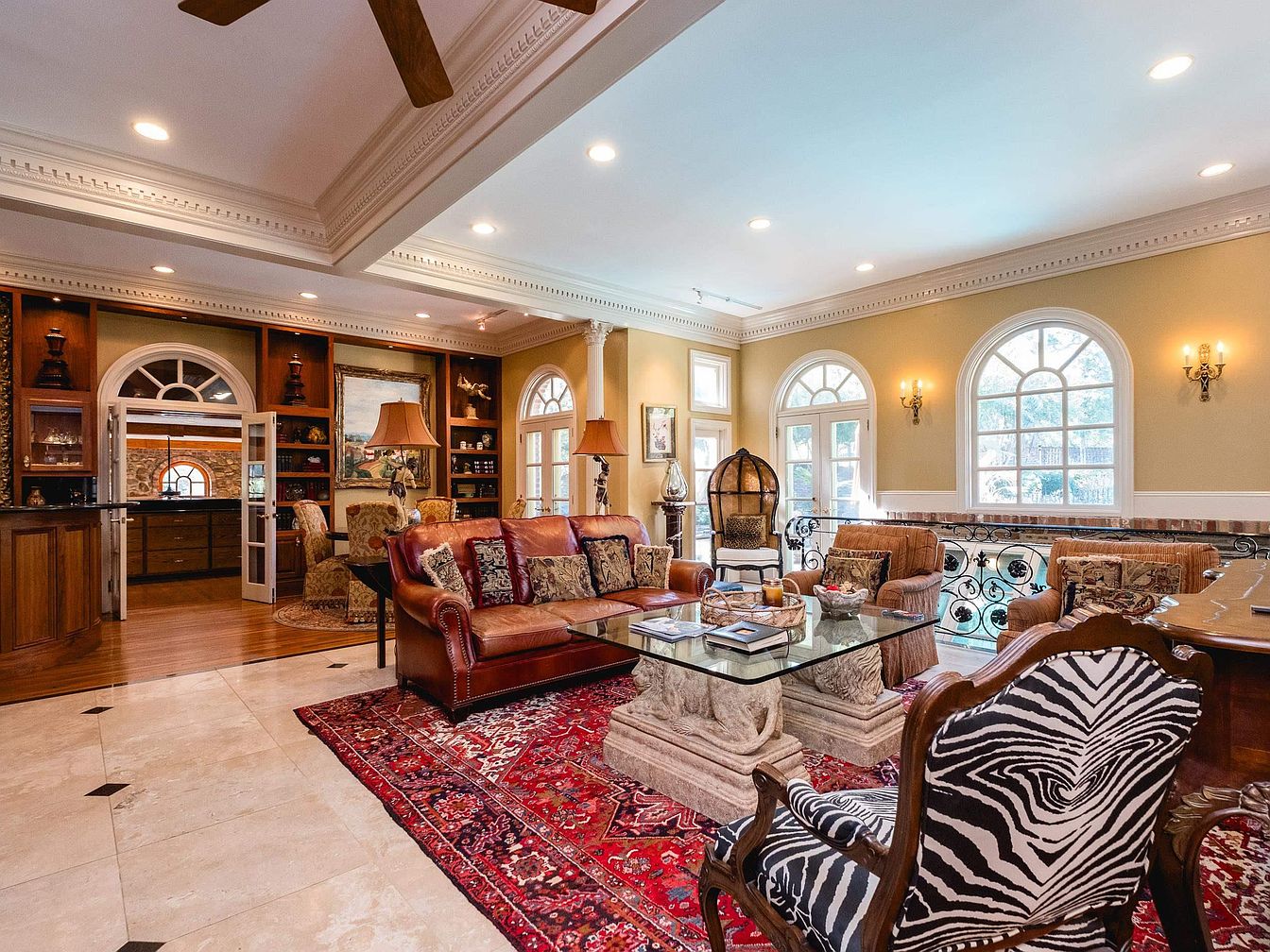 A spacious living room with a classic, sophisticated aesthetic showcases warm beige walls, elegant white crown molding, and multiple arched windows that fill the space with soft natural light. Rich red Oriental rugs cover polished marble and hardwood floors, contrasting with a large, brown leather sofa adorned with patterned throw pillows. The seating arrangement is completed by plush, tan armchairs and a striking accent chair with a black and white zebra print. A distinctive glass coffee table with ornate stone supports sits at the center. Built-in wooden shelves, sconces, and decorative table lamps create an inviting and historic ambiance.