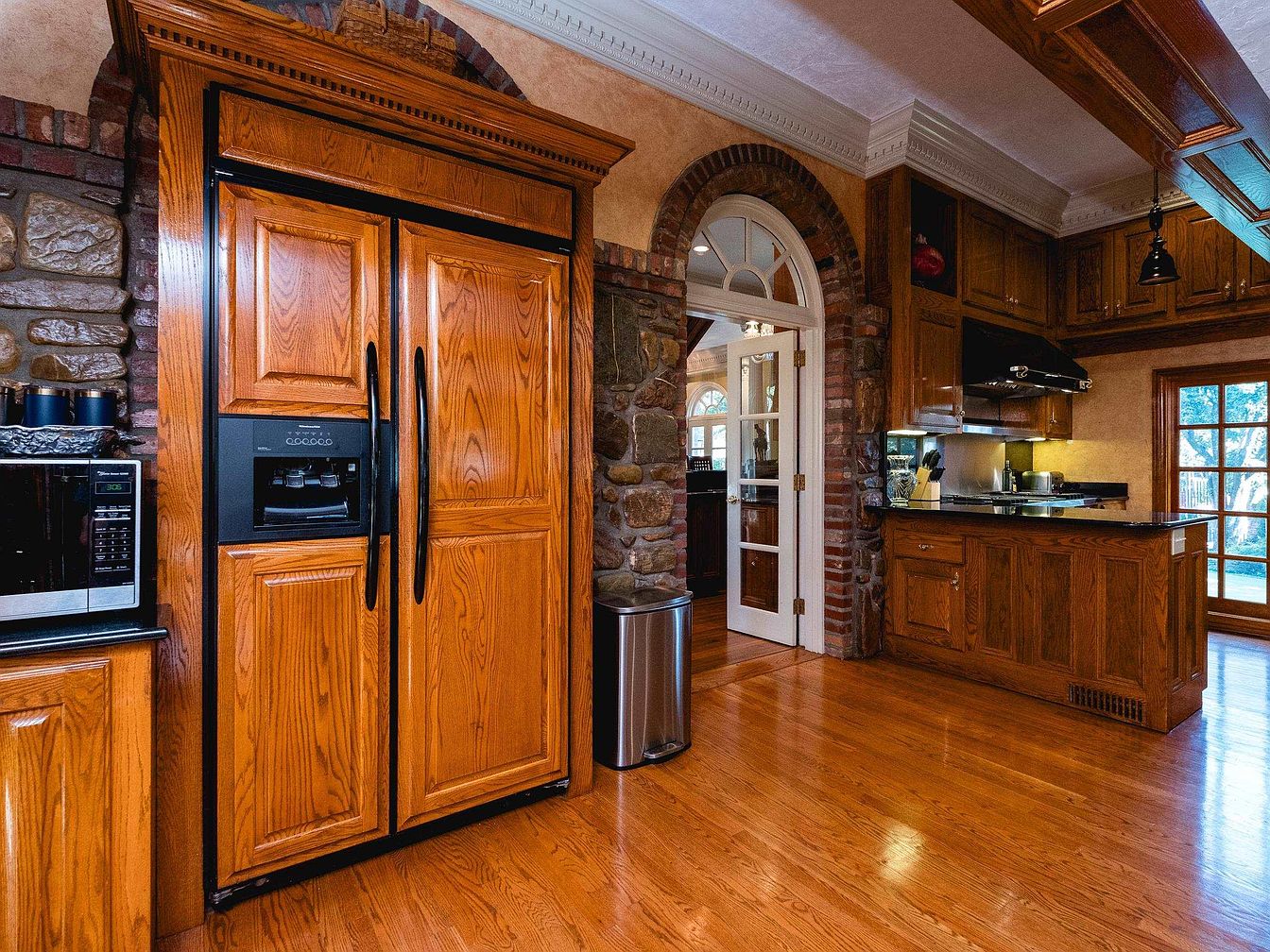 Warm wooden cabinetry with intricate paneling dominates the space, matching the double-door built-in refrigerator and lower cabinets. A stone and brick arch frames a glass French door leading to another area, adding rustic charm that complements the earthy-toned walls. The floors are polished hardwood, enhancing the inviting nature of the kitchen. Black countertops add contrast and anchor the wood tones. Modern stainless steel appliances, including a microwave and range hood, bring a touch of contemporary utility, while decorative crown molding along the ceiling lends an elegant, finished appearance. Large windows flood the area with natural light.
