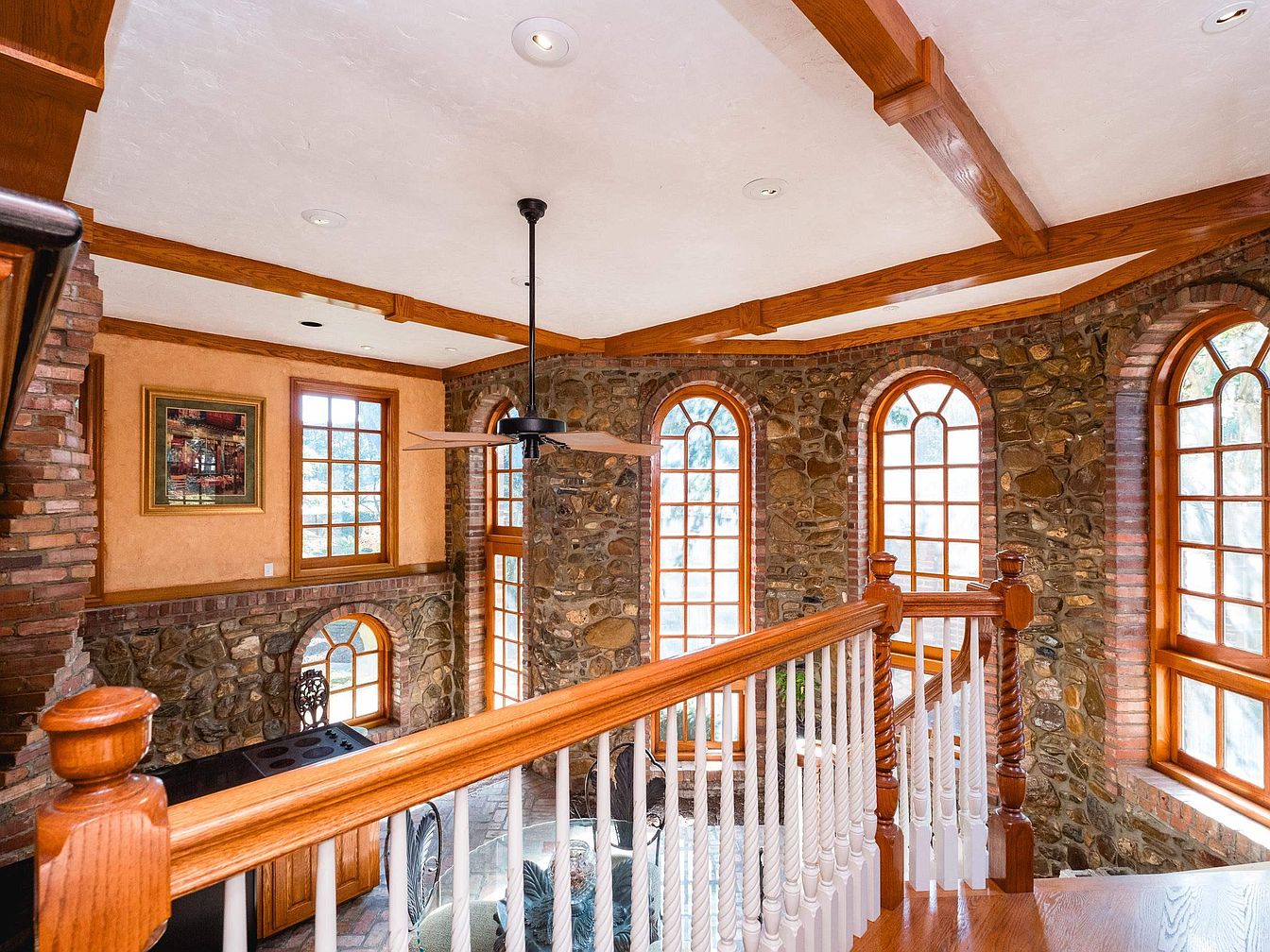 A staircase landing bathed in natural light features curved stone walls with multiple tall, arched windows framed in rich wood, offering a warm and historic character. The stair railing combines turned wooden posts and white spindles, complementing the honey-toned hardwood floors. Exposed wooden ceiling beams cross a white textured ceiling for added architectural interest. An ornate ceiling fan hangs at the center, while an inviting mix of textures is reinforced by the stone, brick, and wood elements. A framed painting and a glimpse into the lower level add further depth and artistic interest to the space.