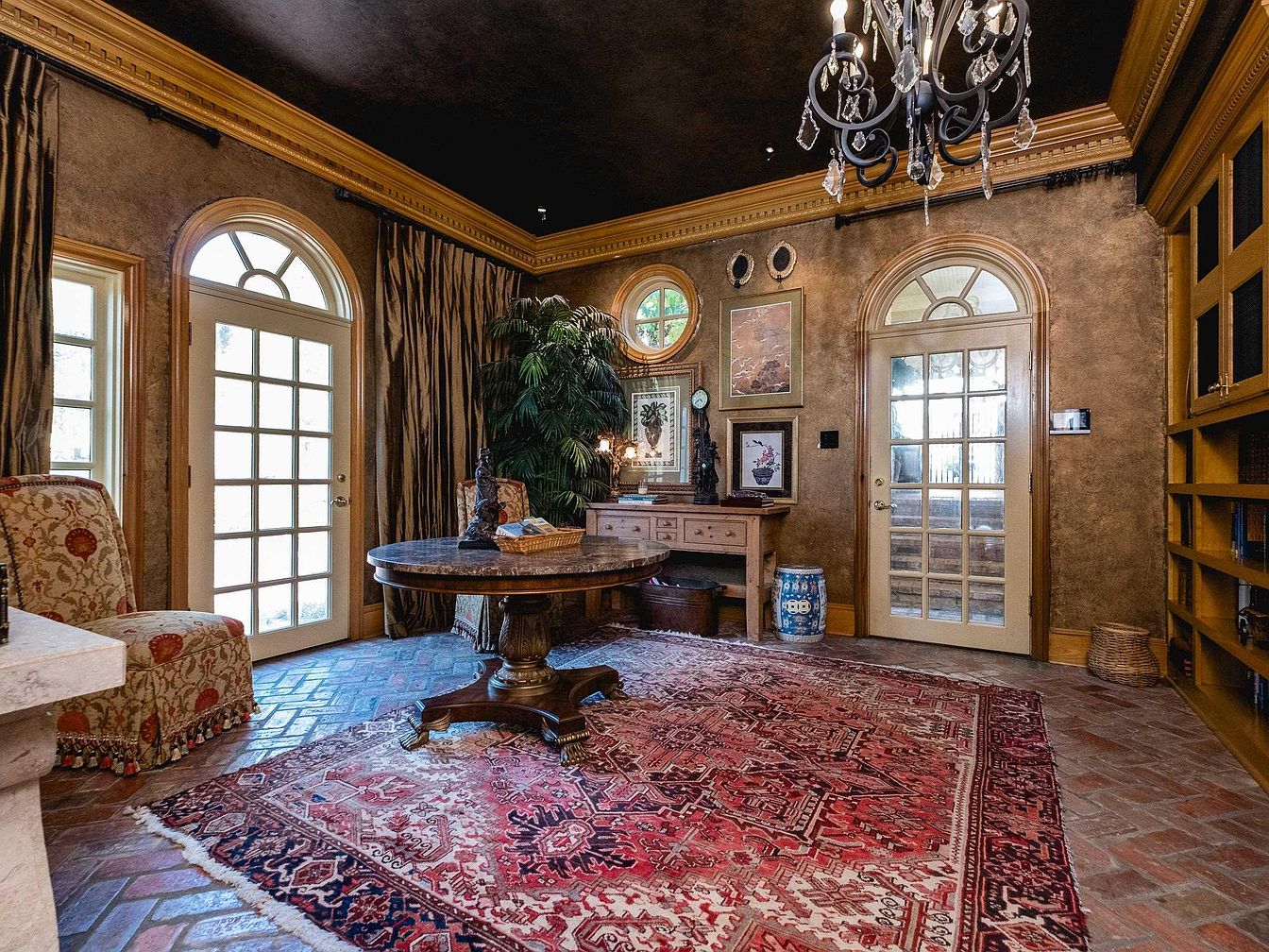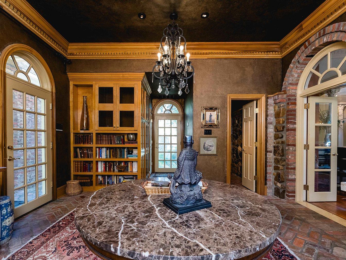 Richly detailed study or library room, featuring a large round marble table in the center with a dark, veined surface and a decorative sculpture as its centerpiece. The space is surrounded by arched French doors and large built-in bookshelves filled with books and decorative vases. Warm brown tones dominate the walls and trim, complemented by golden crown molding and a black ceiling for dramatic contrast. Exposed brick and natural stone accents add a historic, textured character. A classic chandelier with crystal ornaments hangs above, while a patterned rug softens the brick flooring, contributing to the elegant, traditional ambiance.
