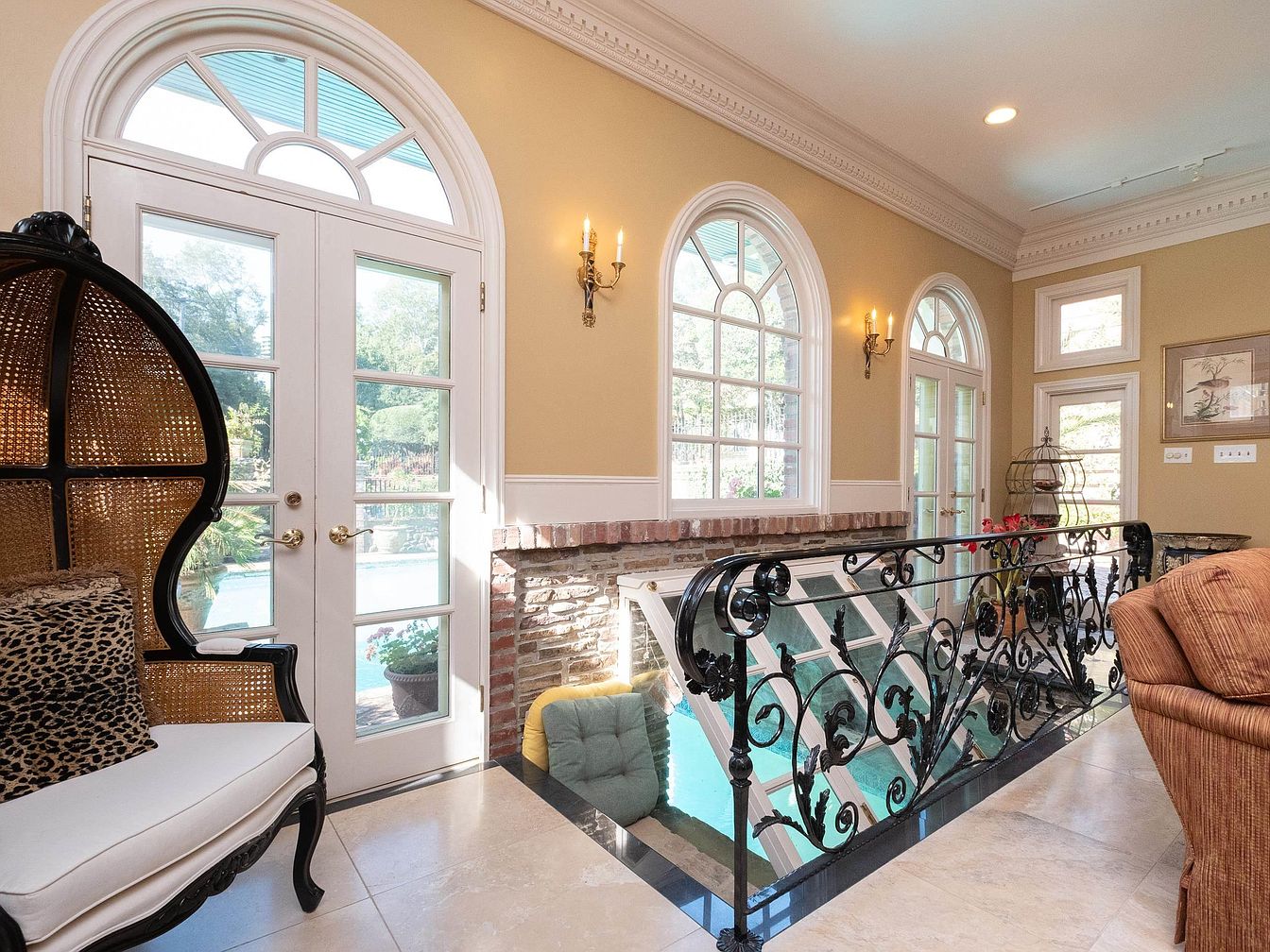 A bright sunroom features large, arched windows and French doors with white trim that allow abundant natural light to flood the space. Warm tan walls with white chair rail molding and detailed crown molding at the ceiling enhance the classic feel. Ornate black wrought iron railing separates the room from a staircase leading down. The floors are polished cream marble, adding to the elegance. Furniture includes a vintage black-framed chair with woven rattan and a leopard-print pillow, adding a hint of eclectic style. Gold wall sconces and exposed brick detail by the stairwell offer a touch of historic charm.