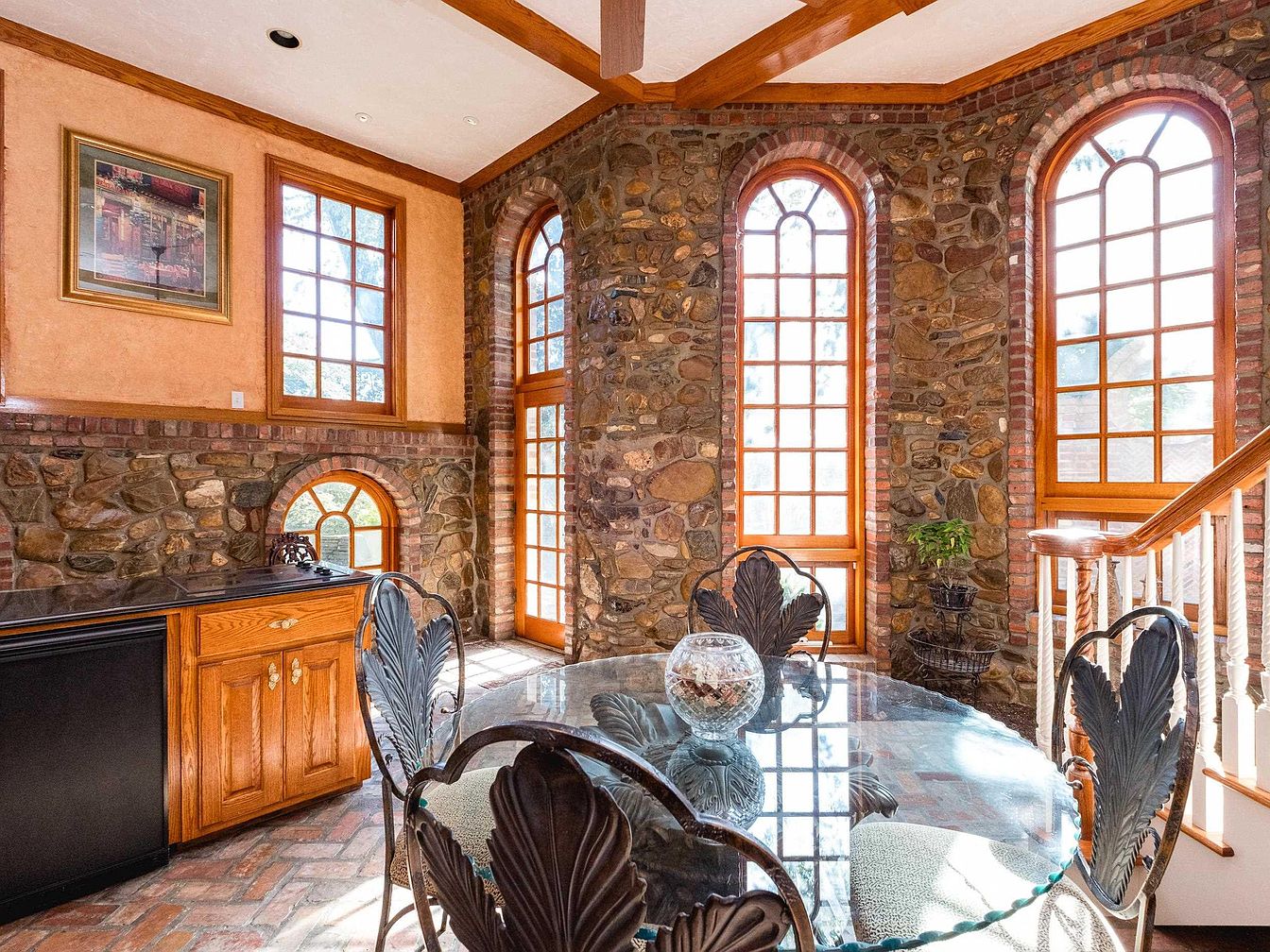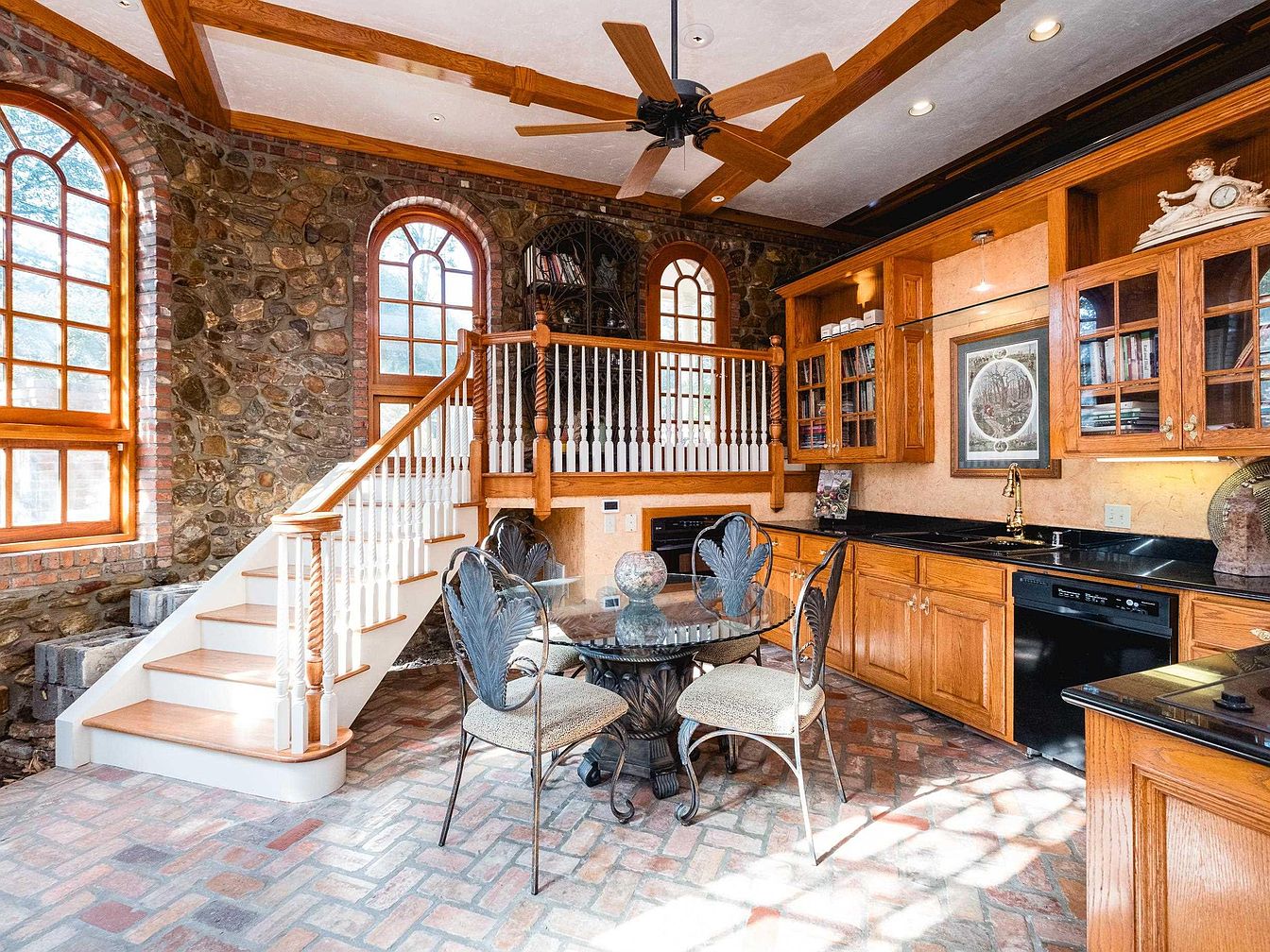 A circular dining table with a glass top and decorative metal chairs sits adjacent to a stairway, surrounded by striking stone walls with arched wooden windows that let in abundant natural light. The warm color palette features honey-toned wood trim, matching cabinetry, and soft peach-painted upper walls, creating a cozy, inviting atmosphere. The floor is laid with chevron-patterned brick, while the ceiling is adorned with wood beams, emphasizing the historic character. A framed painting and a small indoor plant add aesthetic detail, blending rustic stonework with elegant, traditional decor for a bright, welcoming space perfect for casual meals.