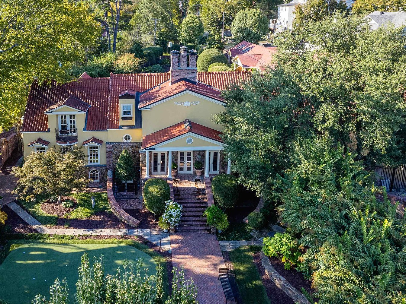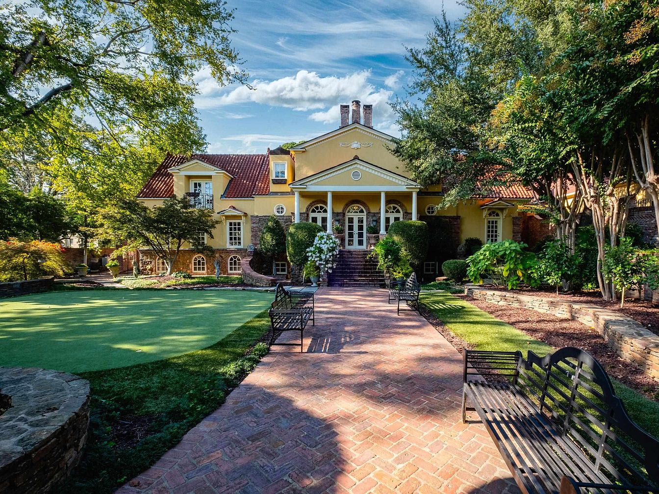 A stately historic house features a warm yellow exterior with red-tiled roofing, showcasing Mediterranean architectural influences. Multiple gables and dormers accentuate the roofline, while white trim highlights the windows and doorways. The front entrance is framed by a graceful pediment supported by columns, leading to brick stairs that ascend from a meticulously landscaped yard. Lush hedges and manicured paths border both sides of the steps, while tall trees and colorful flower beds soften the setting. The foreground reveals a small putting green surrounded by brick pathways, complementing the classic and inviting curb appeal of the property.