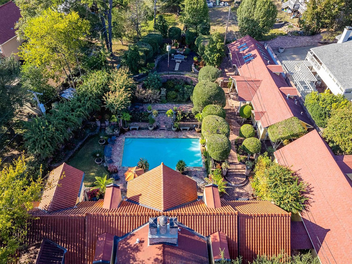 Aerial view centers on a rectangular swimming pool surrounded by tan stone pavers and lush, mature gardens with symmetrical pathways. Manicured round and conical shrubs line the walkways, giving formal elegance. Terracotta rooflines frame the pool area, echoing Mediterranean or Spanish influences. Trees and bushes line the property’s edge for privacy. Seating areas and potted plants cluster around the pool’s edge, with vibrant green foliage contrasting the warm earthy tones of the rooftops and paving. The garden’s geometric layout, ornamental hedges, and careful landscaping create a harmonious, tranquil outdoor living space ideal for entertaining or relaxing.