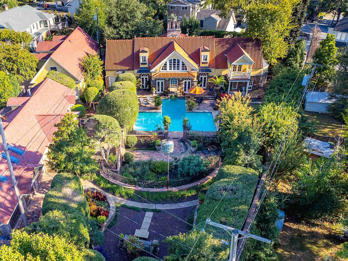 A sweeping aerial perspective reveals lush, formal gardens behind a grand historic home with a red-tiled roof. The symmetrical backyard design includes manicured shrubbery, curved walkways, and neatly trimmed topiaries arranged around brick paths. At the center, a turquoise rectangular pool mirrors the architecture of the house, which features numerous tall windows and dormers. Patios and seating areas provide spots to relax, some shaded with orange umbrellas. The mature trees and extensive greenery create a private, serene oasis, contrasting with the geometric layout of flower beds and footpaths running through the garden and lawn.