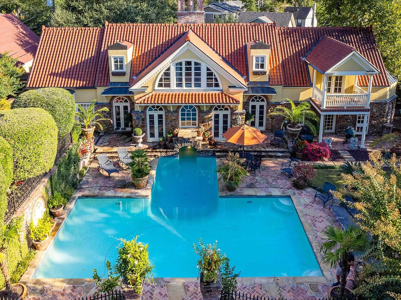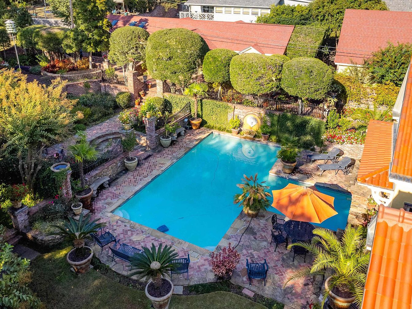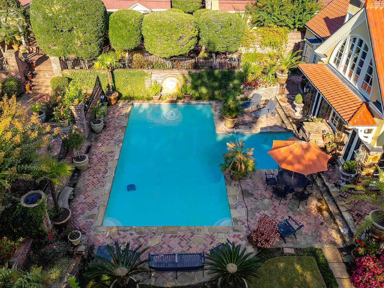 An aerial view reveals a rectangular swimming pool bordered by a wide deck of red and tan herringbone brickwork, surrounded by lush greenery and flower beds. The pool area features large potted palms, wrought iron benches, and stone planters, lending a historic and elegant charm. An orange patio umbrella shades a round metal table with matching chairs, creating a welcoming seating area. Sculpted hedges and brick columns, accented by black iron gates and lanterns, enclose the courtyard. To the side, the house façade has tall windows and a terra cotta tiled roof, complementing the warm, classic landscape.
