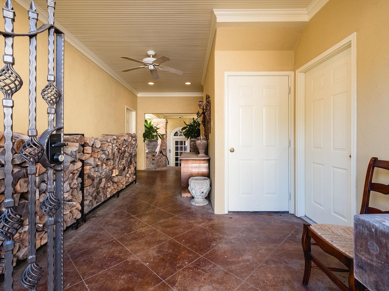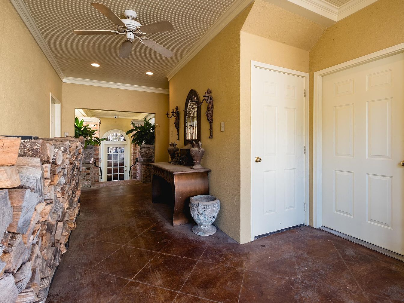 A long, covered hallway lined with stacked firewood on one side and two white paneled doors on the other. The walls are painted a warm beige, complemented by a matching beadboard ceiling with crown molding and inset lighting. A large ceiling fan with wooden blades hangs above, enhancing the welcoming ambiance. Along the right wall, a rustic wooden console table is adorned with pottery and decorative urns, while a mounted mirror and metal wall art add interest. At the far end, natural light filters in through French doors, flanked by lush potted plants that bring a touch of greenery indoors.