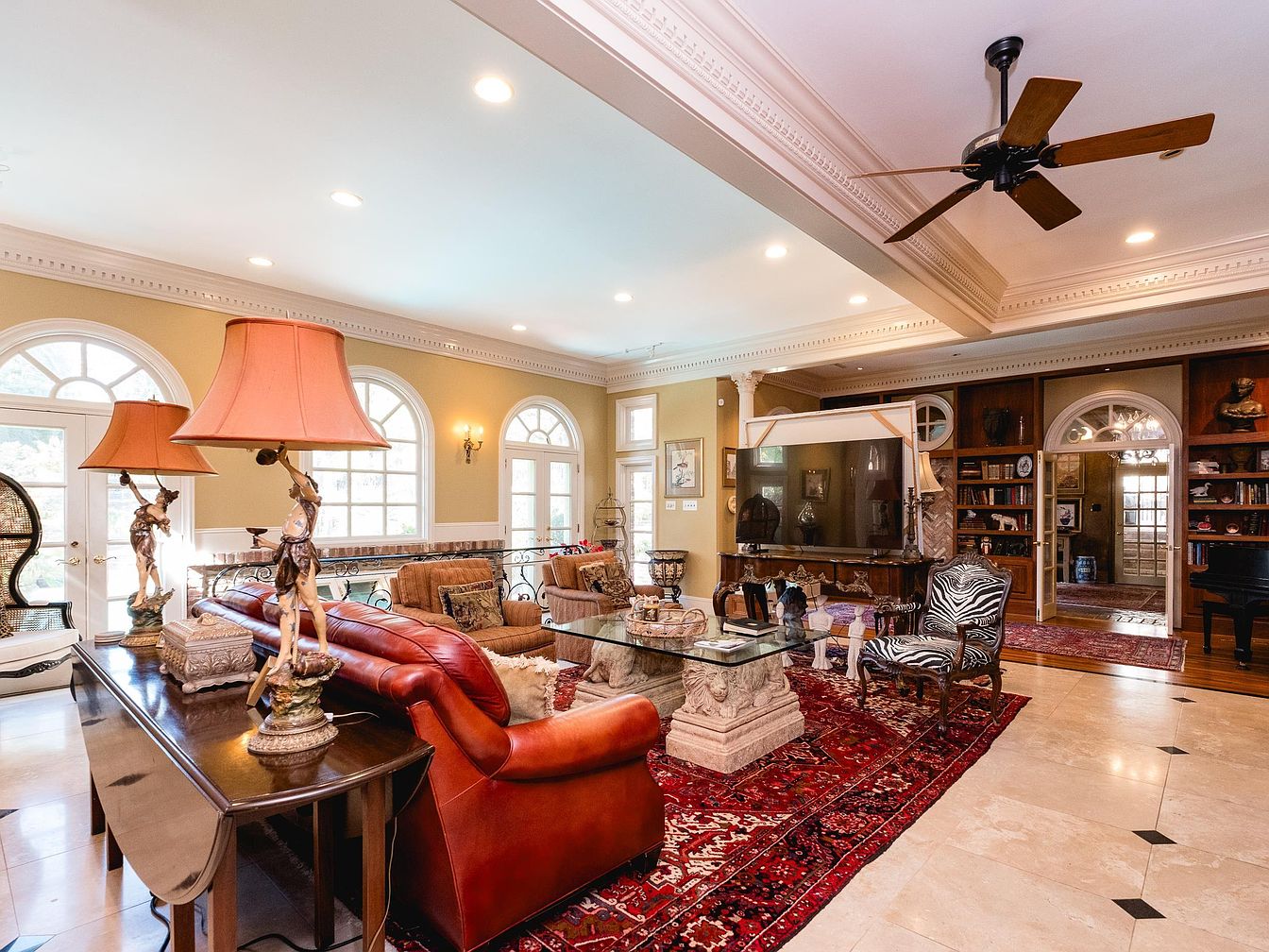 An expansive, elegantly appointed living room features a sophisticated blend of classic and eclectic styles. The walls are painted a soft beige, with large arched windows and French doors that fill the space with natural light. Crown molding and recessed lighting adorn the ceiling, along with a dark wood ceiling fan. Plush seating, including a red leather sofa and patterned accent chairs, surrounds a glass-topped coffee table resting on an ornate red Persian rug. Decorative statuette lamps sit on a polished console table. Built-in shelves, a grand piano, and curated art pieces highlight the stately yet inviting atmosphere.
