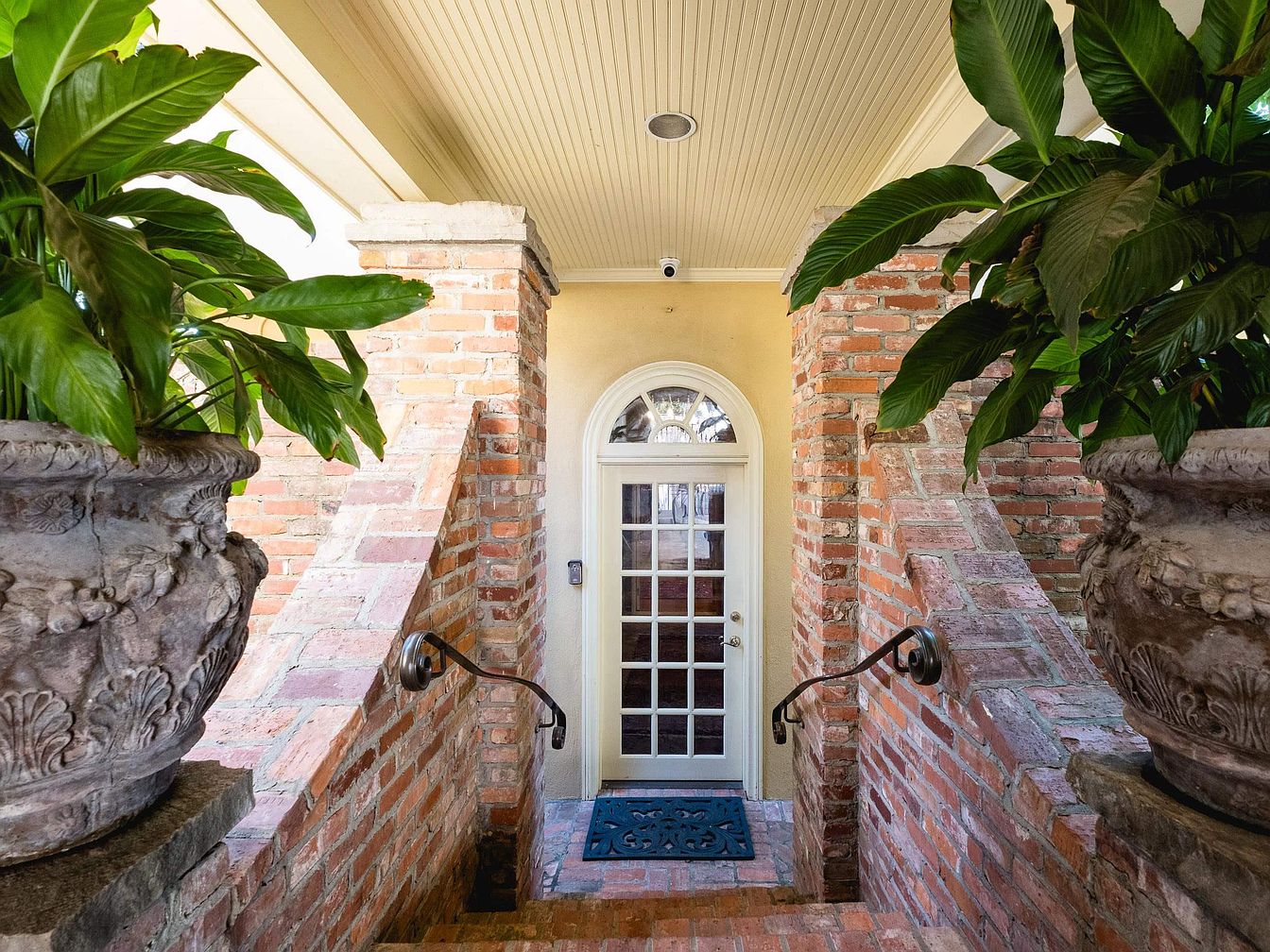 A narrow brick staircase leads up to a glass-paned door with a classic arched transom window above it. The walls framing the stairs are constructed of exposed, textured red brick, angled slightly outward and capped with stone. Ornate stone planters, perched atop either side of the entrance, hold large, leafy green plants, adding a lush touch to the space. A decorative black mat sits at the base of the door. The ceiling overhead is clad in pale, cream-colored beadboard with recessed lighting, enhancing the elegant, historic charm. Black iron handrails curve alongside the stairs.