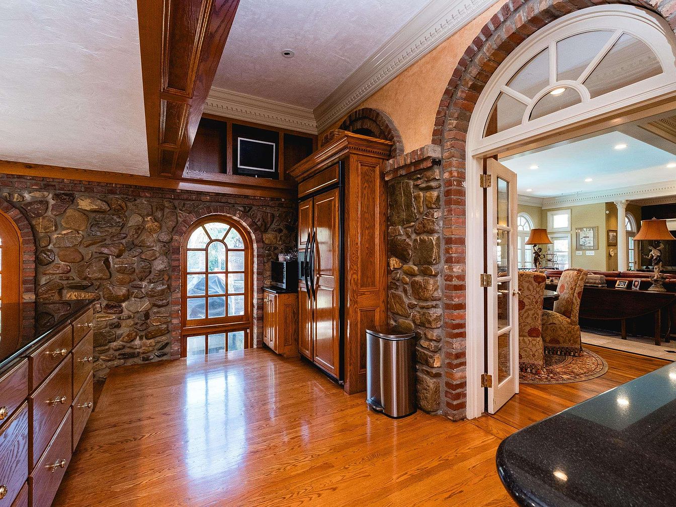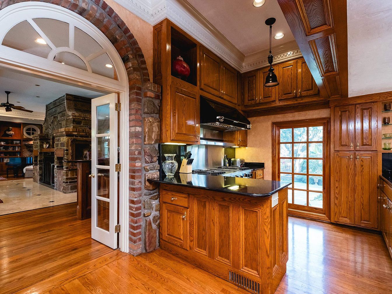 This kitchen features rich oak cabinetry and matching wood floors that create a warm, traditional atmosphere. Black stone countertops provide a sleek, contrasting surface, while a modern stainless steel range and hood add a practical, contemporary touch. A large archway with exposed brickwork and a decorative white transom separates the kitchen from the adjacent living space, offering both visual interest and architectural distinction. A glass-paneled French door opens toward a room with a stone fireplace and built-in shelving. Abundant natural light filters in through a set of tall wooden-framed windows and a glass door, further illuminating the elegant crown molding and classic pendant lighting overhead.