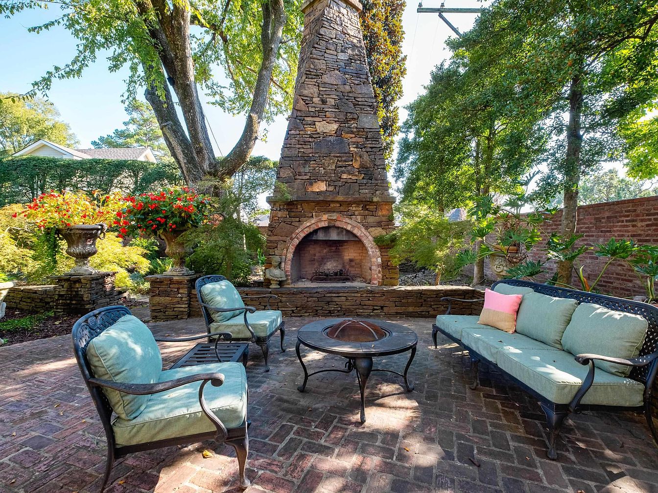 A spacious outdoor patio is set against a backdrop of tall, leafy trees and lush landscaping. A dramatic stone fireplace with a rustic chimney serves as the focal point, situated along a brick retaining wall. Comfortable wrought iron patio furniture with soft, pale sage-green cushions surrounds a central metal fire pit. The brick paver flooring complements the earthy tones of the stonework. Large urns overflowing with vibrant red flowers and dense greenery add bursts of color and texture to the scene. The surrounding brick privacy wall and mature foliage create a secluded, inviting atmosphere for relaxation or gatherings.