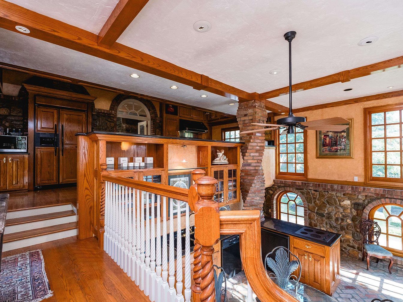 Warm wood tones dominate this split-level kitchen space, featuring a crafted wooden railing with white spindles overlooking a sunken cooking area. Exposed wooden beams cross the ceiling and tie into the cabinetry and trim, reflecting a rustic yet elegant aesthetic. The stone accent wall and brick chimney add historic character, complemented by arched windows that let natural light fill the room. Steps descend to a lower kitchen area surrounded by cabinetry, a dark cooktop island, and vintage chairs. Soft gold and earth tones create a cozy, inviting atmosphere. Artwork and decorative elements further enhance the historic charm of the room.