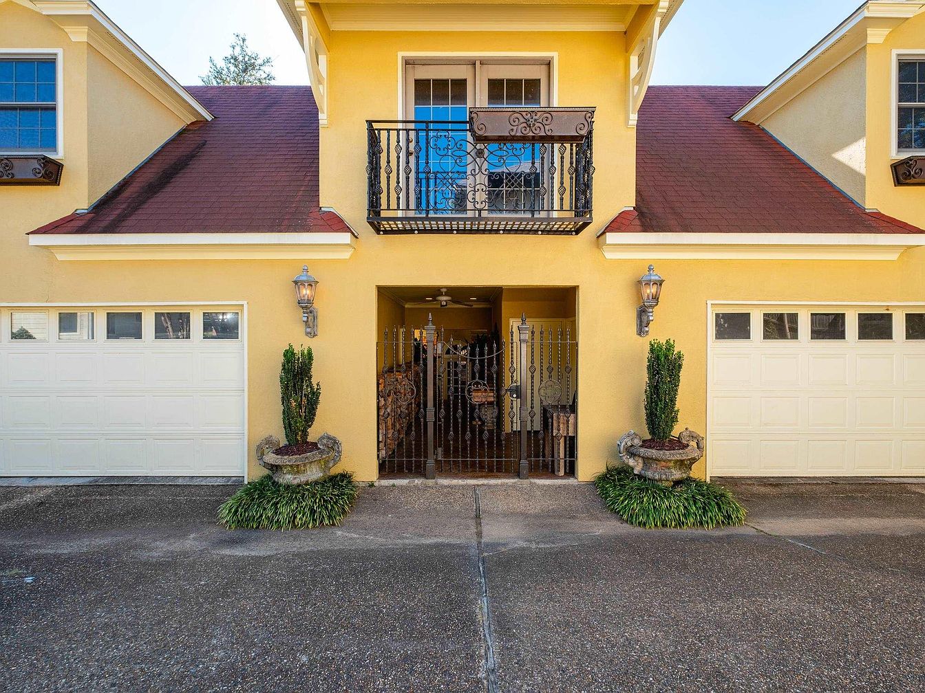 A symmetrical front exterior features two white-paneled garage doors flanking a central entryway. The house is painted a warm yellow with trim in an off-white shade, complemented by a red sloped roof. The entryway is set back under an archway, secured with ornate black iron gates, and topped by an intricate wrought-iron balcony. Two vintage-style lantern sconces frame the entrance, and large stone planters with tall greenery are positioned on either side, surrounded by low, lush plant beds, giving the approach an elegant, inviting presence.