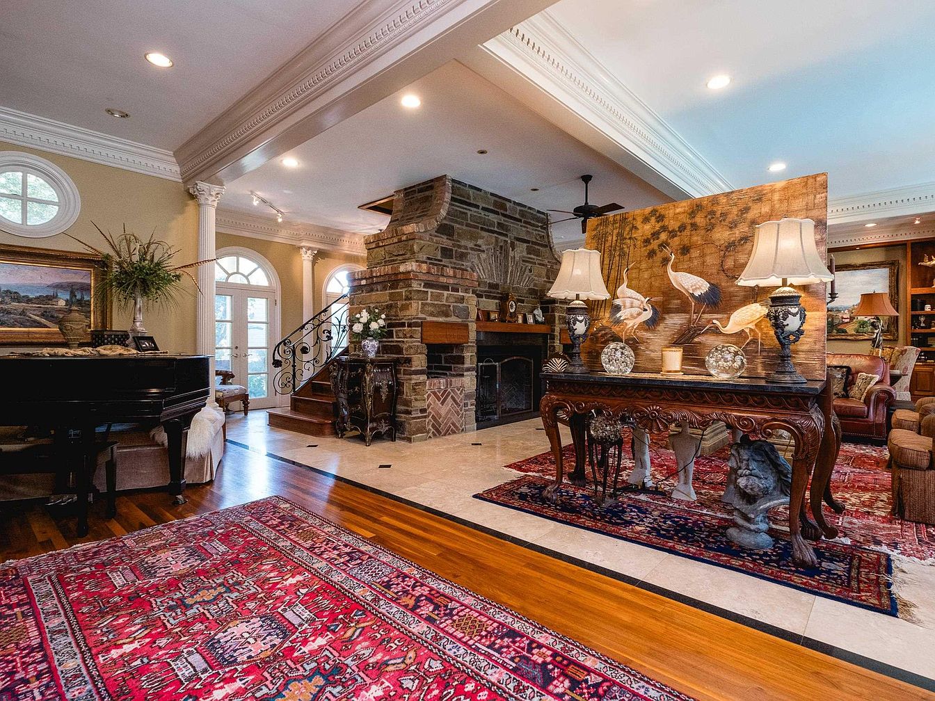 A grand living room filled with rich, traditional design elements. Ornate crown molding and classical columns frame the doorway and arched windows, casting light onto the polished wood and marble floors. A central stone fireplace borders a cozy sitting area, separated by an intricately carved wooden console table topped with two elegant lamps and a painted screen featuring large white birds. Persian rugs in vibrant reds and blues provide warmth underfoot. A large black grand piano sits to the left, while plush upholstered chairs and shelves of books and art fill the background, creating a sophisticated, inviting atmosphere.