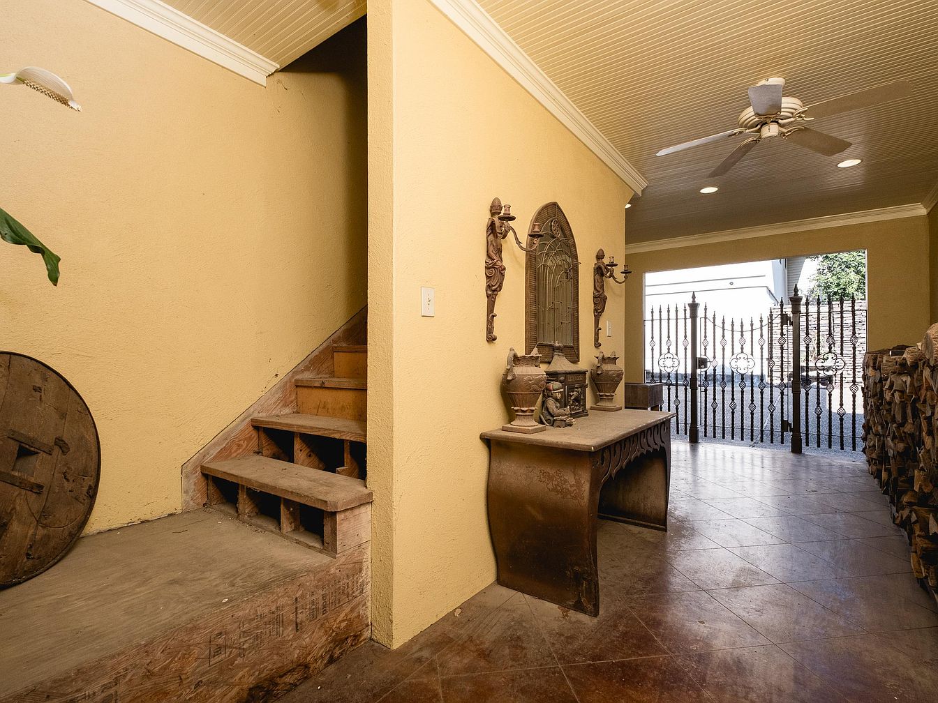 A narrow, rustic stairway with unfinished wooden steps sits to the left, leading upward alongside a textured pale yellow wall. A decorative wrought-iron table is placed against the wall, topped with classical urns and small sculptures, adding a vintage touch. Above the table hangs a large ornate wall sconce with candle holders flanking an arched iron mirror. The floor is finished in a dark brown tile laid diagonally, and to the right, a stack of firewood suggests utility and warmth. Tall wrought-iron gates at the far end open to the exterior, letting in natural light. A ceiling fan is mounted above, aiding ventilation.