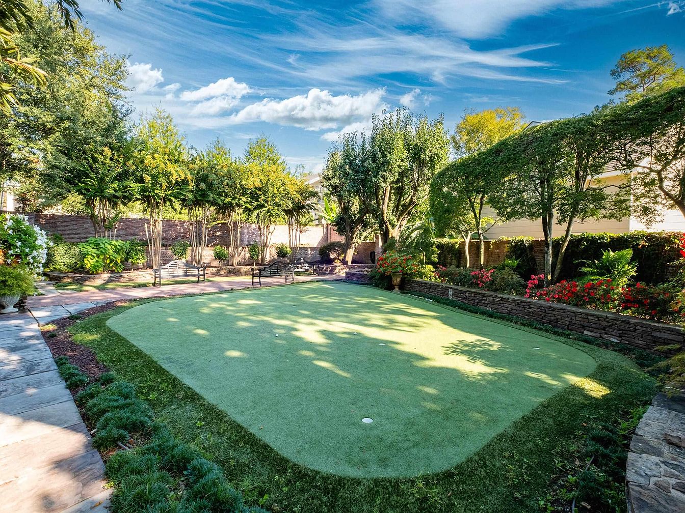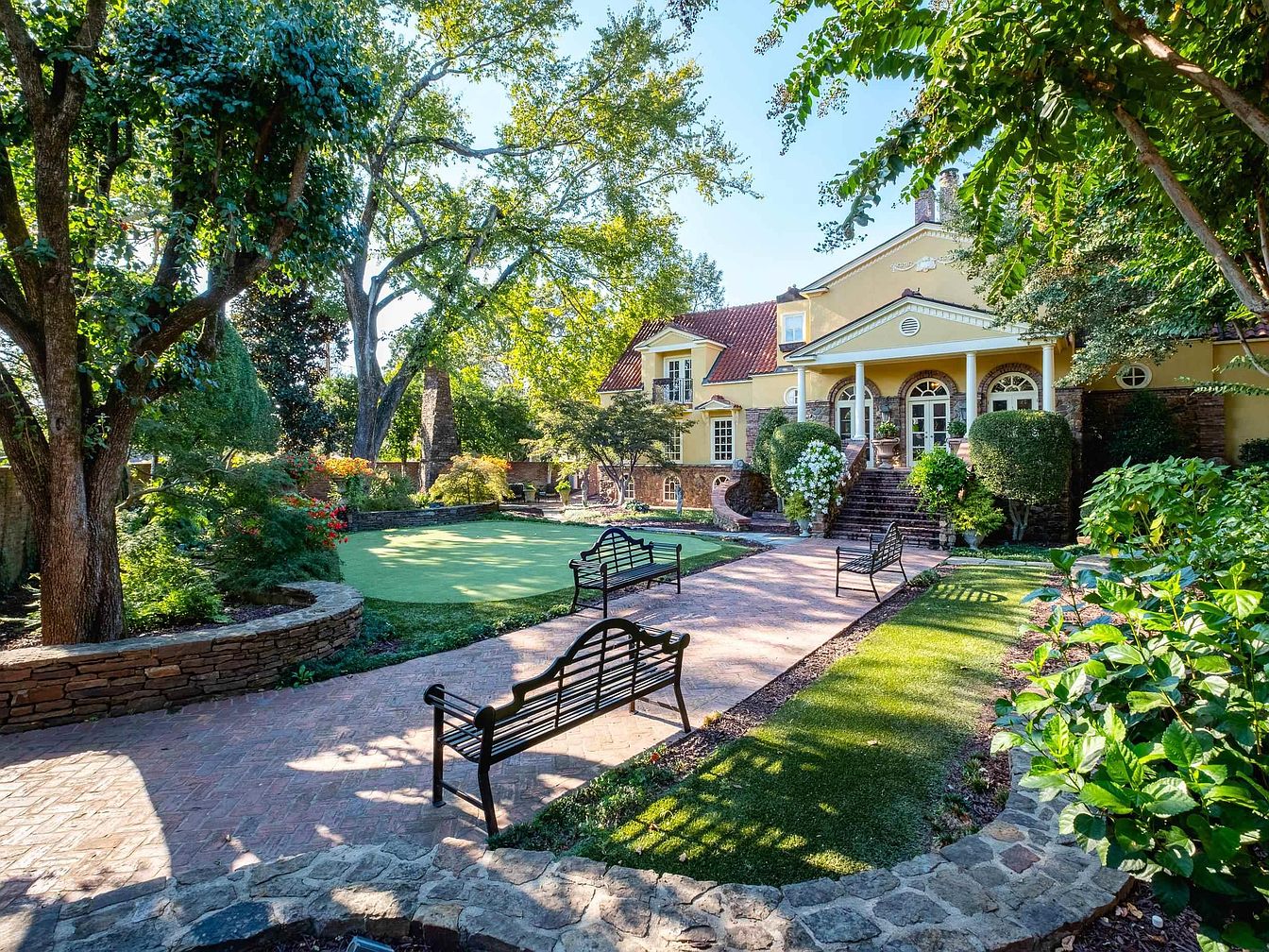 A stately historic home’s garden features a manicured putting green encircled by lush landscaping and mature trees. The house showcases classic architectural details with yellow stucco walls, a terracotta tiled roof, and arched windows in a stone base. The raised veranda is supported by white pillars and overlooks the putting green, accessible by curved stone steps flanked by trimmed hedges and white statues. A brick pathway winds through flower beds and greenery, contributing to a serene, elegant outdoor atmosphere. Decorative molding and intricate masonry highlight the home’s refined, timeless character against the vibrant blue sky.