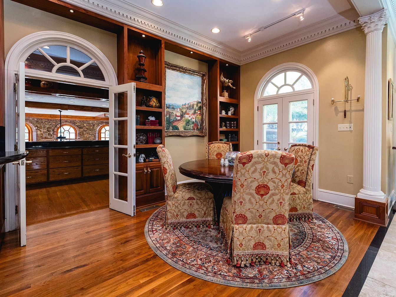 A cozy dining space features a round wooden table surrounded by four upholstered chairs with ornate, gold and red patterned fabric and elegant tassel trim. The chairs are positioned on a richly colored Persian-style rug over polished hardwood floors. Built-in wooden shelves flank a wide arched doorway fitted with double French doors, showcasing decorative objects and a framed landscape painting. The room’s walls are painted a warm, muted beige, contrasted by intricate crown molding and a decorative white column. Large arched windows and French doors bring in natural light, enhancing the classic, historic American home ambiance.
