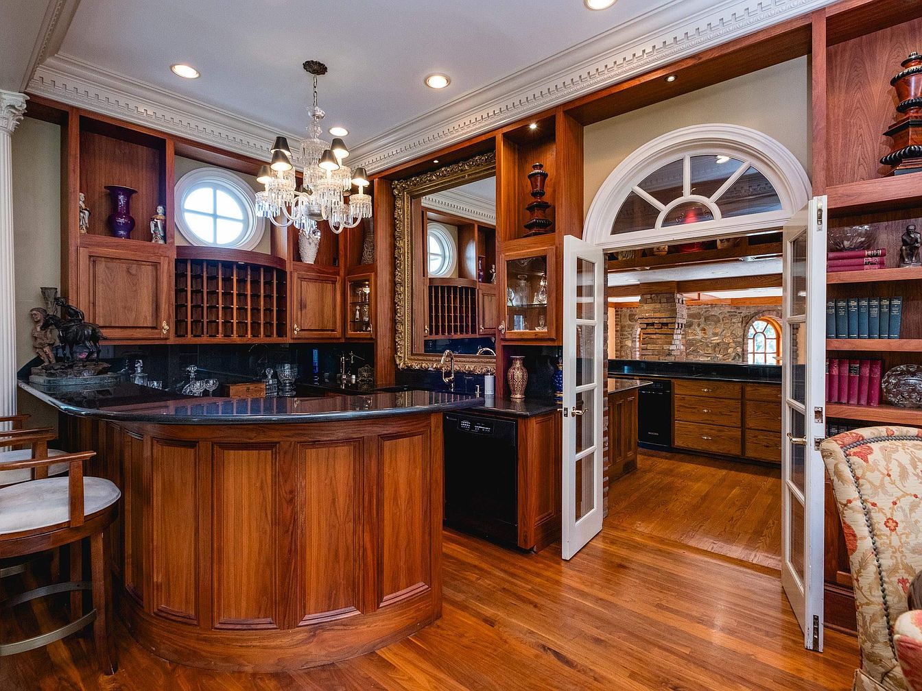 This room features a rich, classic home bar with dark wood cabinetry and a polished wood counter that curves into the room. Glass shelving displays crystal stemware, and cubbyholes for wine storage are integrated into the cabinetry. A grand crystal chandelier hangs above the bar, adding elegance to the space. French doors with divided light panes open to reveal a kitchen area with rustic stone accents and warm wood cabinetry. The floor throughout is a medium-toned hardwood, and the walls are trimmed with elaborate crown molding. Ornamental vases, books, and sculptural pieces add character to the shelves.