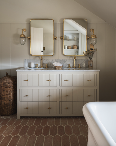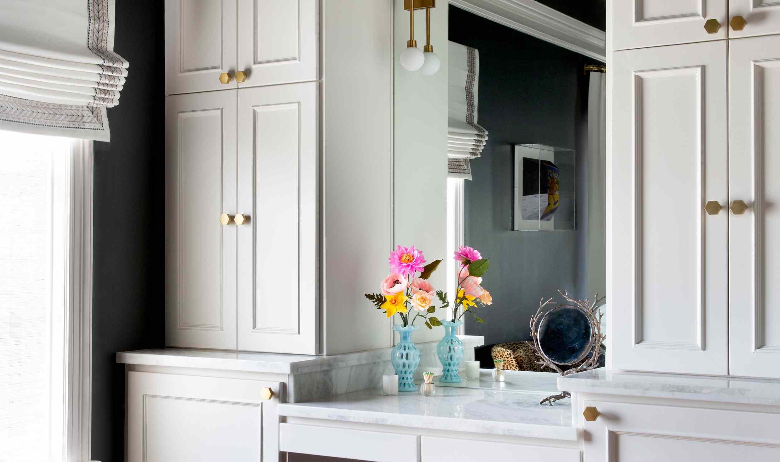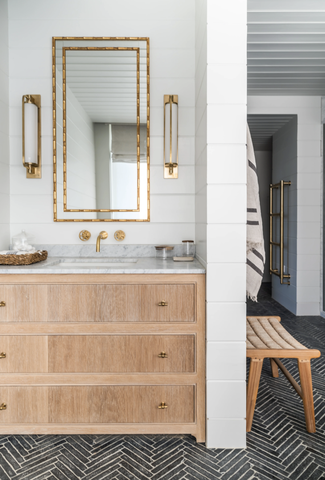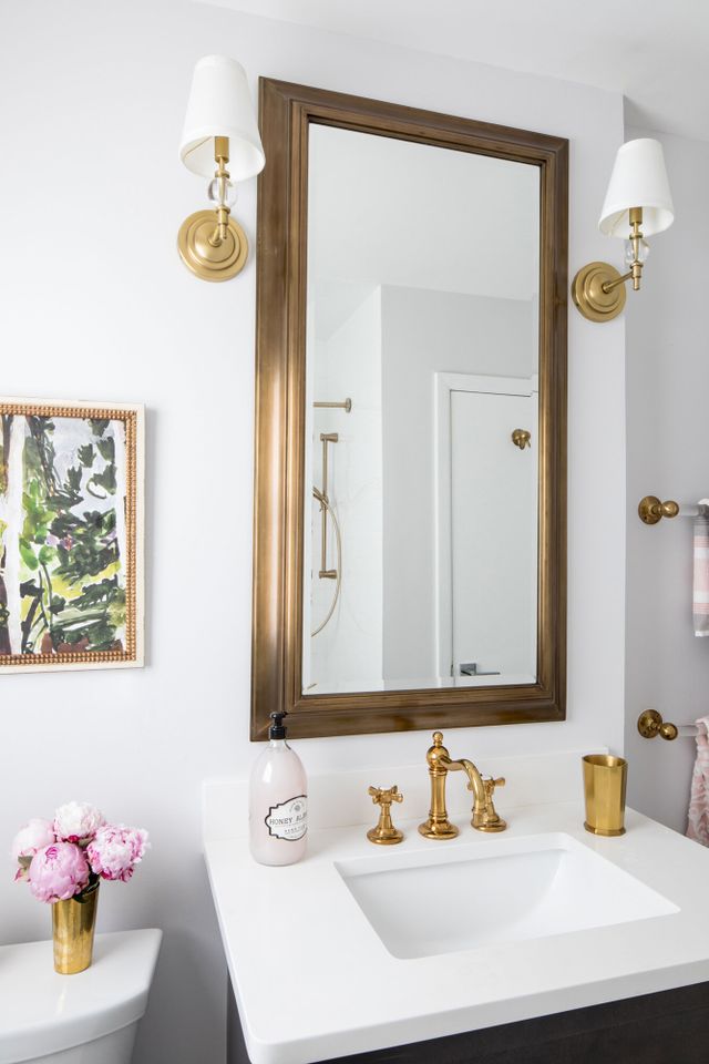 No matter whether you rent or own, you can easily add personality to the bathroom by switching out the builder-grade hardware for knobs and pulls that speak to your style—brass is always a timeless option.
