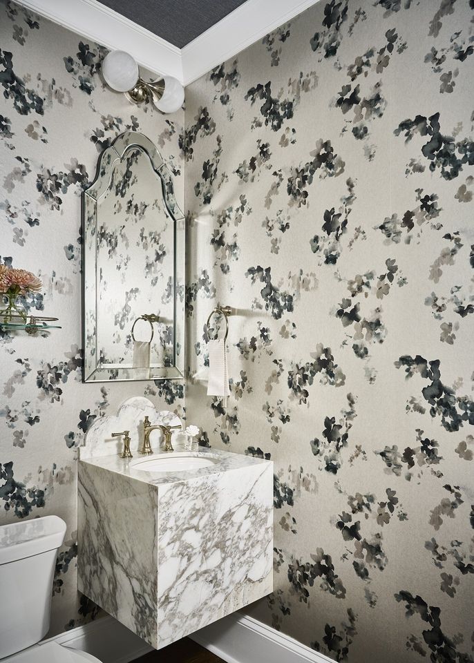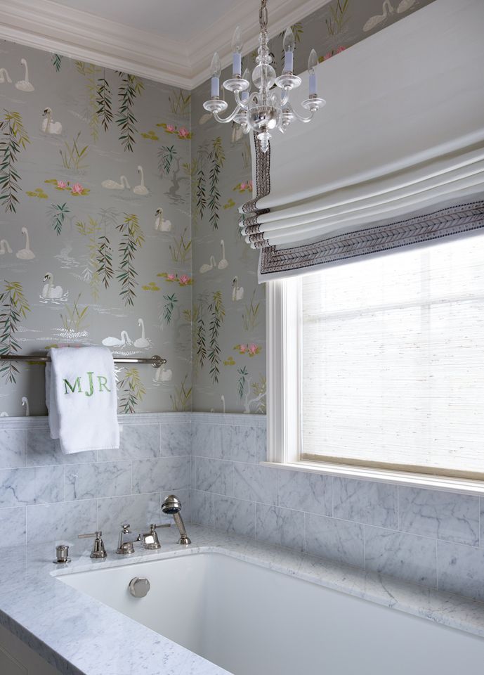 Transform plain bathroom walls with the addition of wallpaper—whether peel-and-stick or permanent—and your space will appear much more custom and complete. Even if you opt to paper just half of a wall, as seen here, the addition of a cheerful print will breathe life into your space.