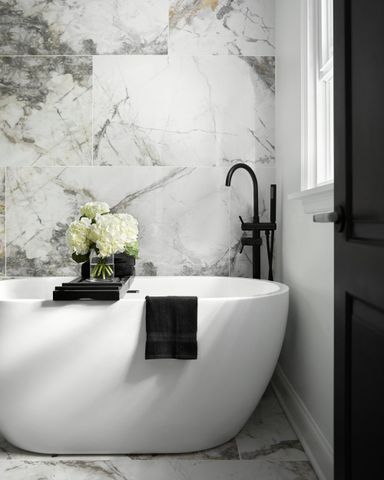 Marble tile shines in this high-end-looking bathroom, which is drenched in neutrals. The black, white, and gray color scheme results in a hotel-like look.