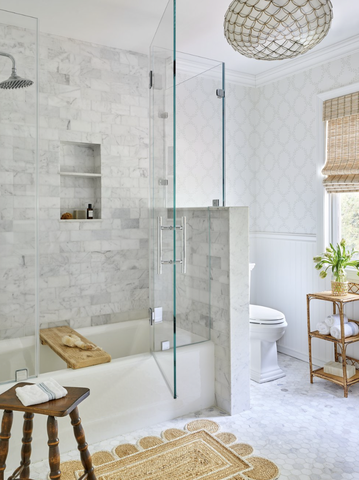 Every bathroom requires some sort of bathmat, but rather than simply going the utilitarian route, opt for a piece that plays to the overall design scheme. This scalloped jute mat plays to the other warm tones spread throughout this small yet sweet bathroom.