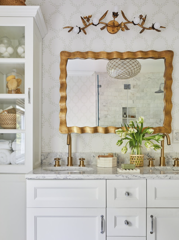 If your bathroom features a medicine cabinet that sticks out like a sore thumb, consider removing it and replacing it with a mirror that better complements your aesthetic. These two cut glass mirrors are elegant and timeless.