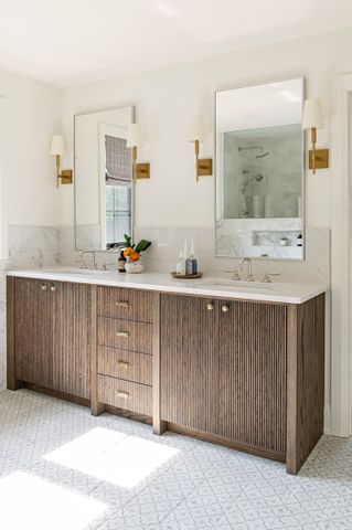 In terms of backsplash material, both designers agree that subway tile is a timeless pick for the bathroom. "Its application has been around for decades," Hunter says. "Whether they are in the traditional subway style, stacked, or herringbone they bring a timeless feel," Newman adds.