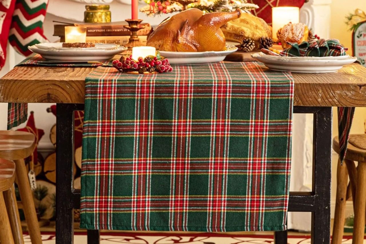 To elevate your holiday decor, consider the StangH 2-Piece 84-inch Velvet Curtains, which add a dramatic touch to any room. The Aqothes Green Red Plaid Christmas Table Runner brings classic red and green tartan patterns into your space, and the Edishine Small Table Lamp adds a warm glow with its wooden base and rattan shade.