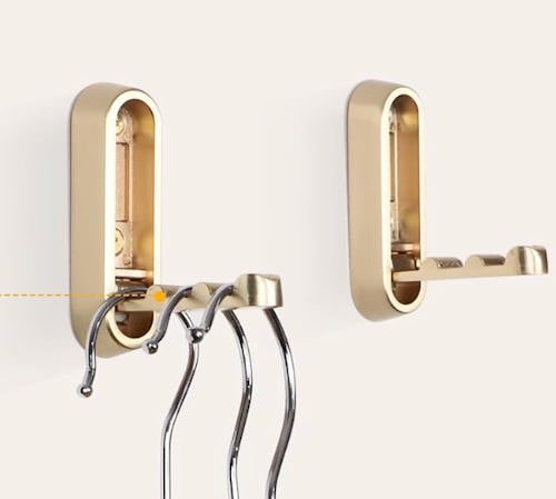 When folded up, these two hanging hooks are hardly noticeable on the wall. But when you unfold them, each one can hold up to 40 pounds of coats, purses, umbrellas, and more. This is the gold finish, but black and silver are also available. All mounting hardware comes included.