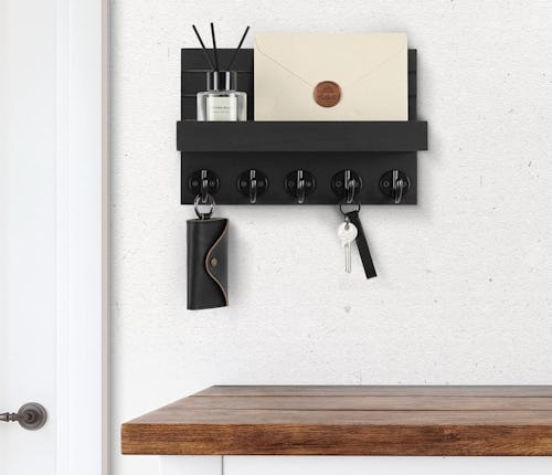 Position this wooden holder next to your garage or front door as a sleek spot to stash keys, mail, your wallet, and other important things. It boasts a roomy storage shelf, plus five dual hooks for hanging items. It comes in five neutrals in the listing.