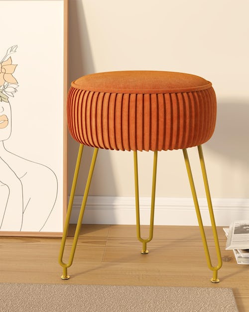 The versatility of this round stool is impressive. Use it as a footstool near an armchair, as a seat for your vanity, in a guest room for extra seating, and in other areas throughout your home. The circular pick is covered in a luxurious velvet material with golden splayed legs that bring a mid-century modern element. Various colors (with and without hidden storage) can be found in the listing.