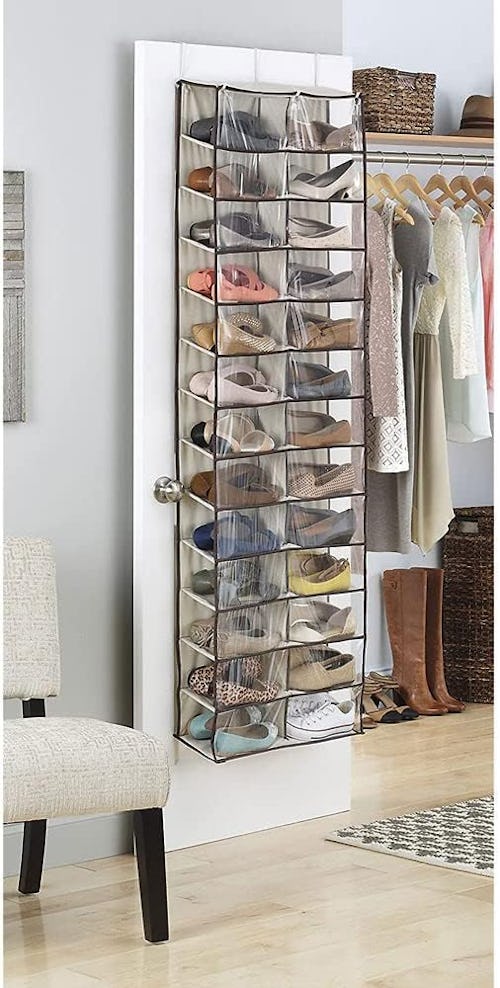 Short on storage for your shoe collection? Turn to this shoe shelf system that mounts on a door using metal hooks. It can neatly organize and store up to 26 pairs in its vinyl slots that are see-through (so you can find the pair you want to wear more easily).