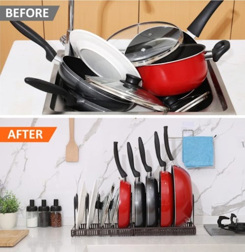 This pot and pan organizer can be extended or separated based on your needs. It holds nine pots, pans, and lids for a neater kitchen.