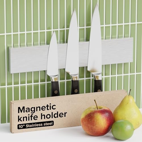 This magnetic knife bar holds knives and other metal tools on the wall. It is made from sleek stainless steel and is easy to install.