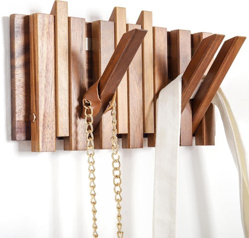 This coat rack is designed to save space with its fold-up hooks. It is made from acacia wood and features a natural finish.
