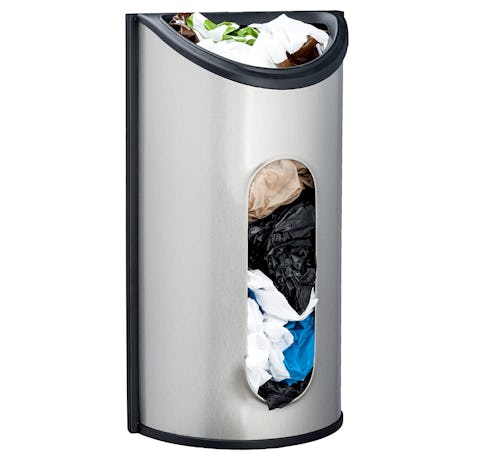 This wall-mounted holder keeps plastic bags organized and easily accessible. It has a brushed stainless steel finish.
