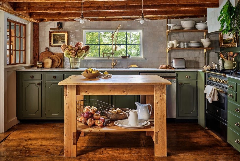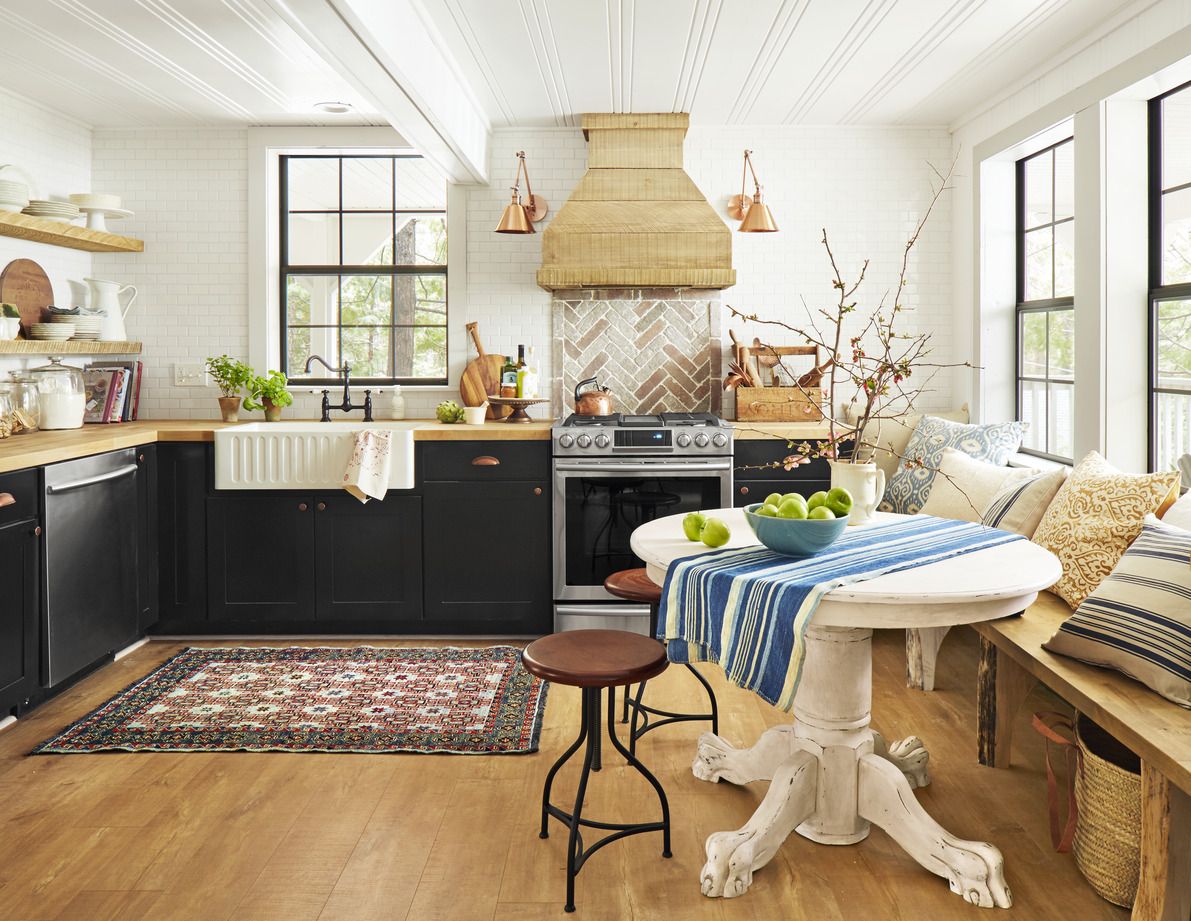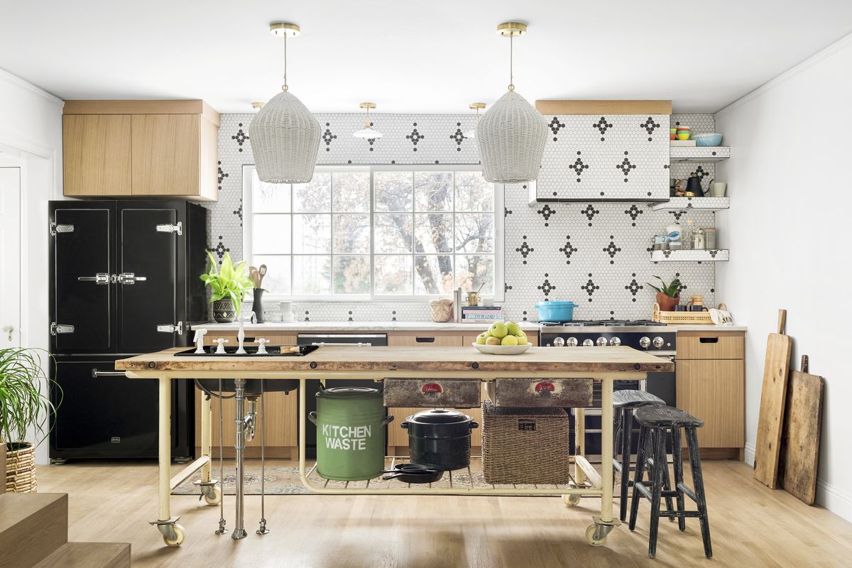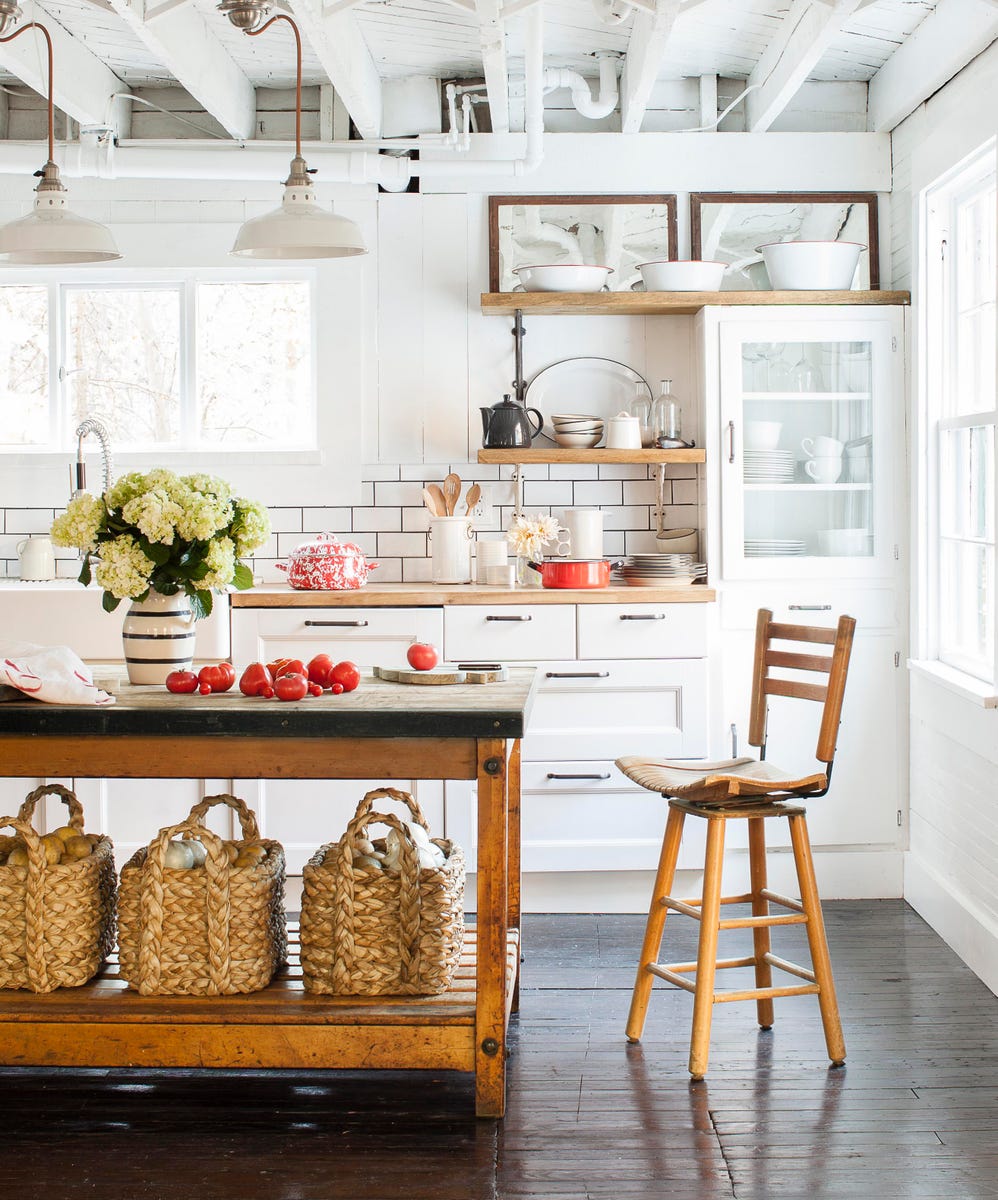 Leanne Ford opted for simple subway tile in her Pennsylvania home, pairing it with an antique bakery table that functions as the kitchen island.