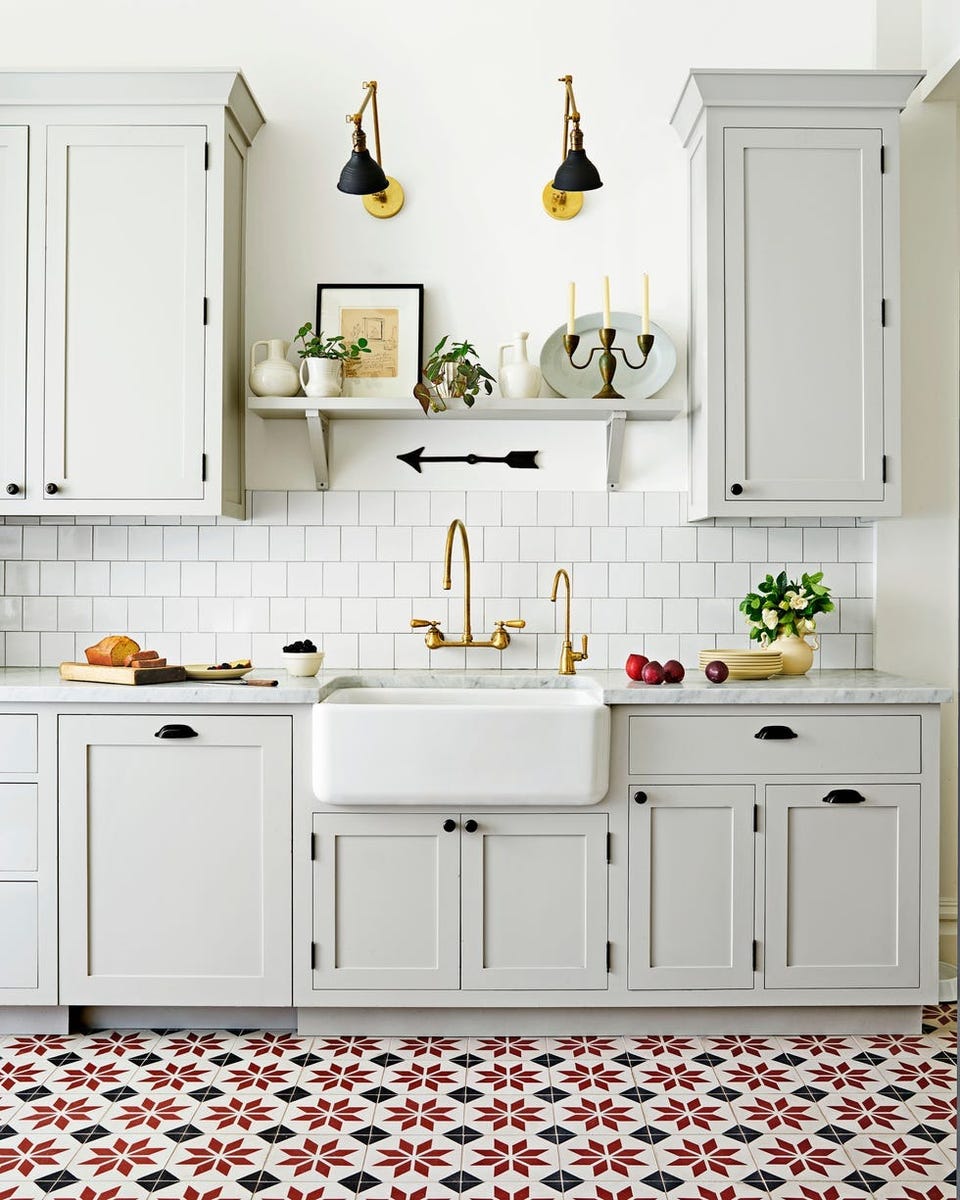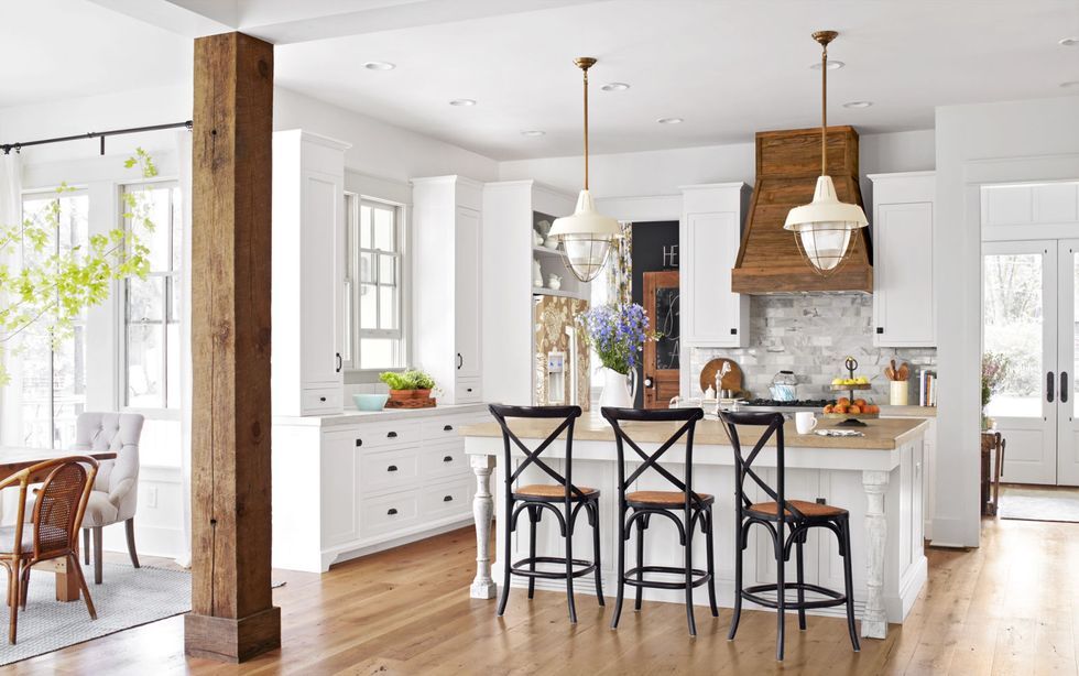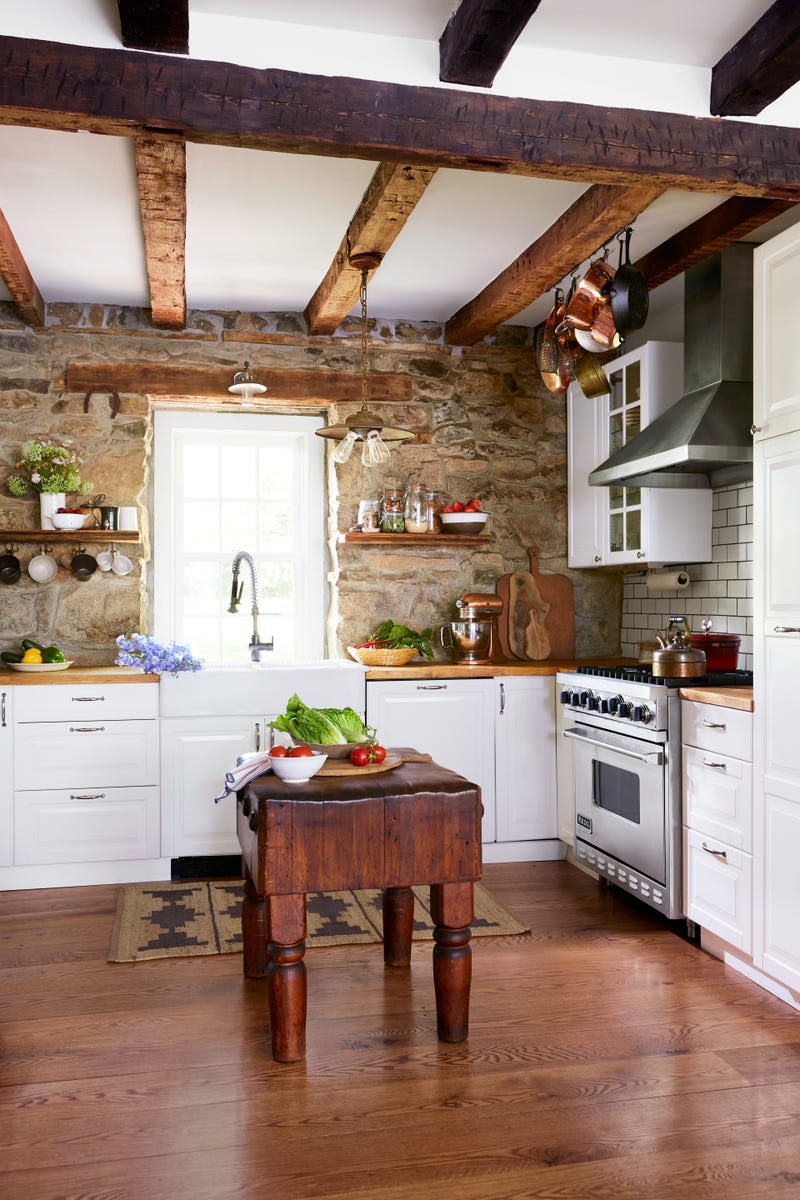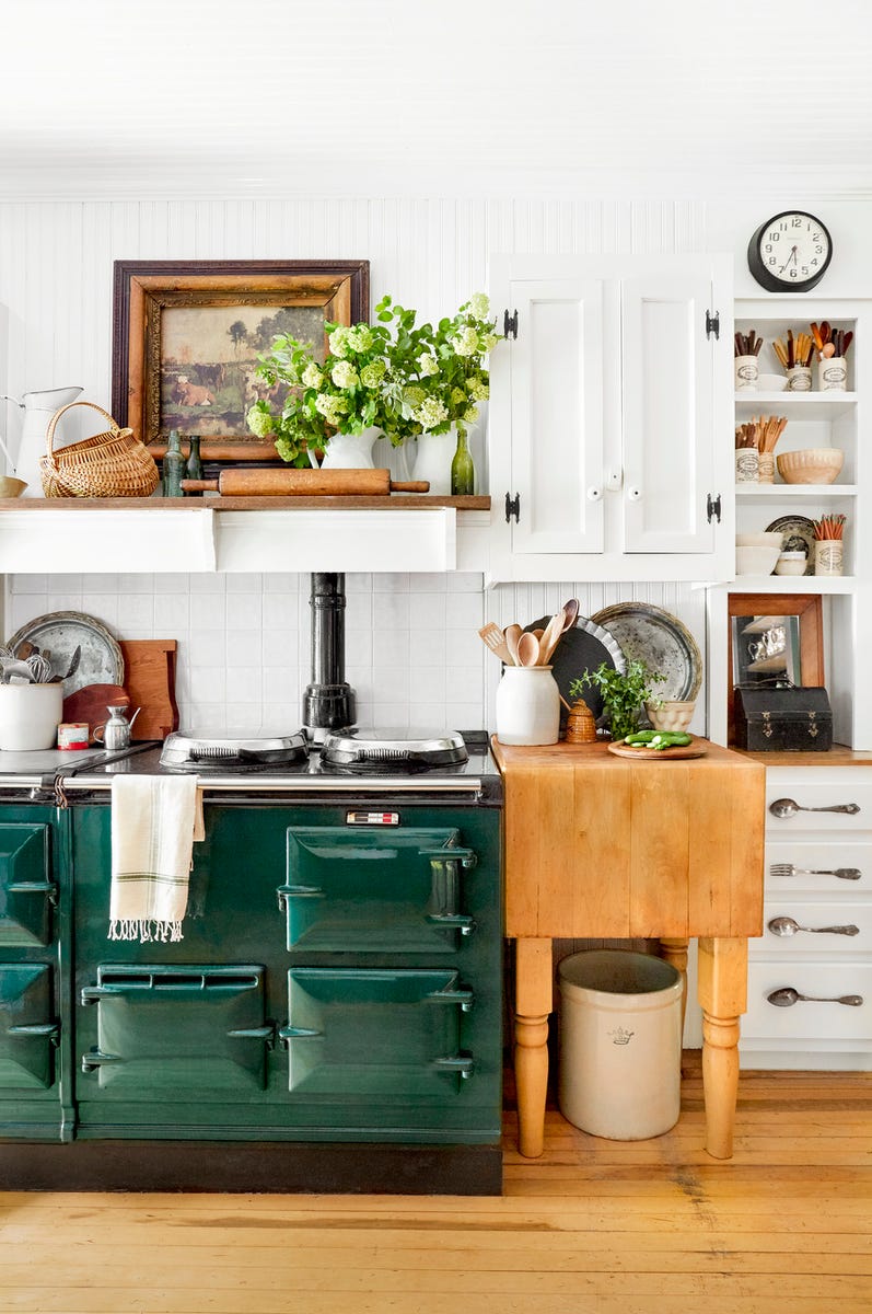 Leanne Ford opted for simple subway tile in her Pennsylvania home, pairing it with an antique bakery table that functions as the kitchen island.
