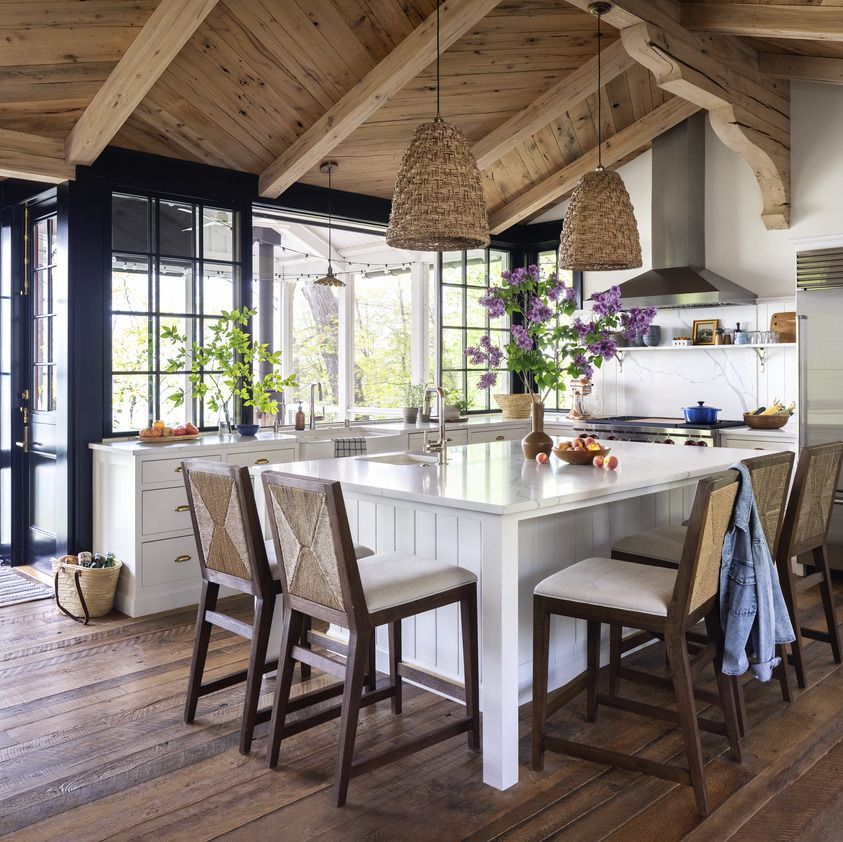 Trinity Holmes anchored this open kitchen with a trio of 12-pane windows, a custom window ledge, and a shapely Carrara quartz backsplash.