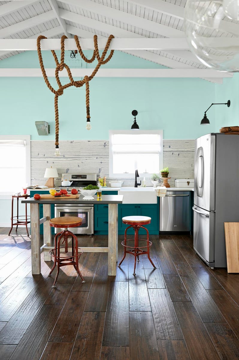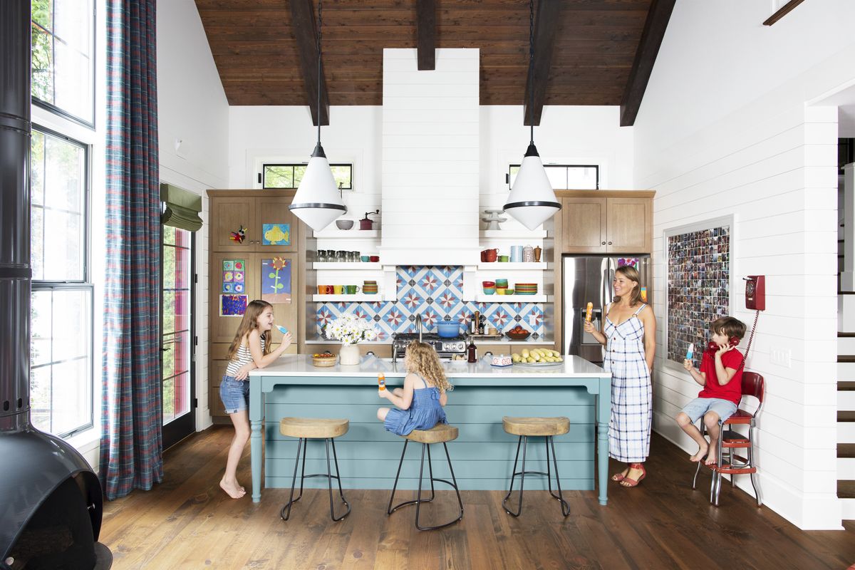 Emily Henderson’s bungalow features faux bois tiles that pair well with turquoise walls and Ikea cabinetry.