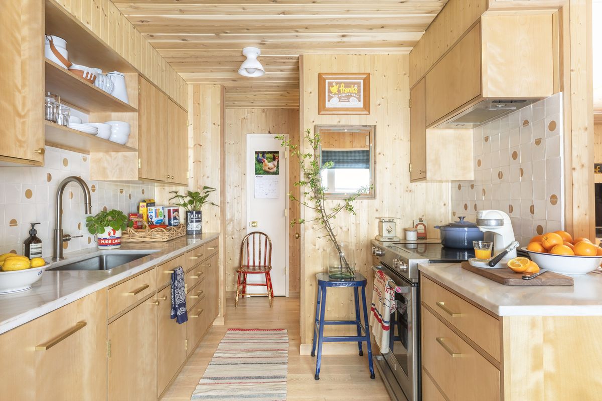 Max Humphrey created a unique kitchen with plywood cabinets, brass hardware, and a whimsical polka dot backsplash.