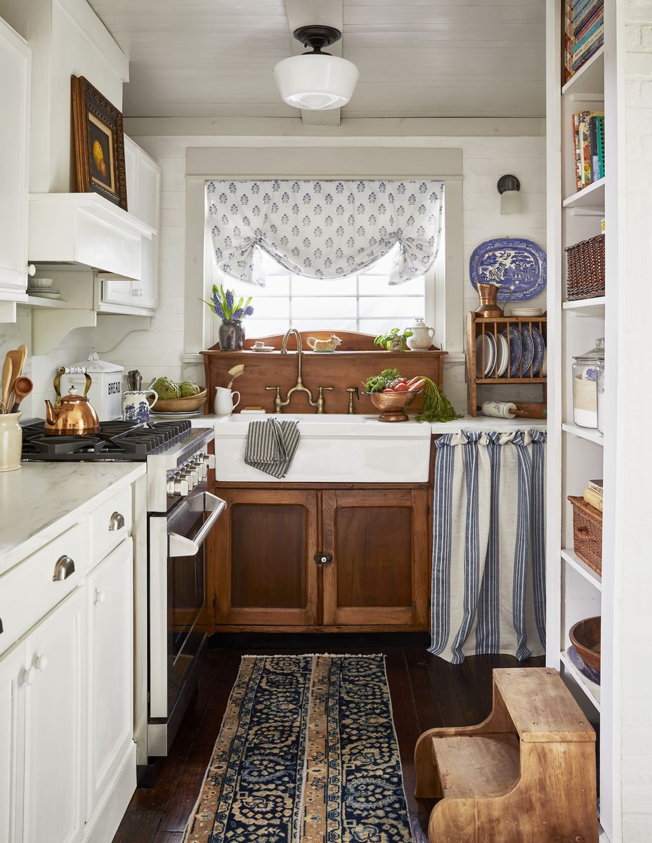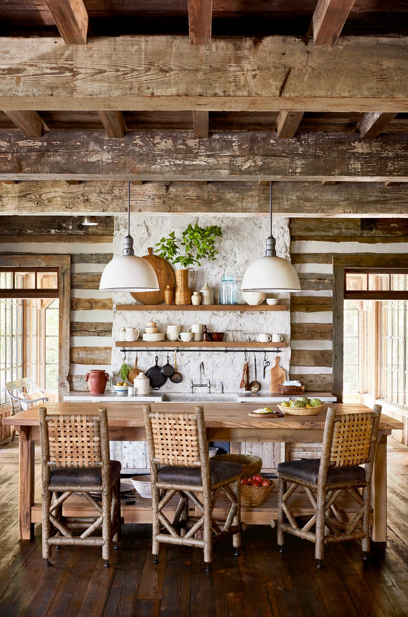 A white-painted stone backsplash brings lightness to a North Carolina mountain cabin, maintaining its soul and texture.